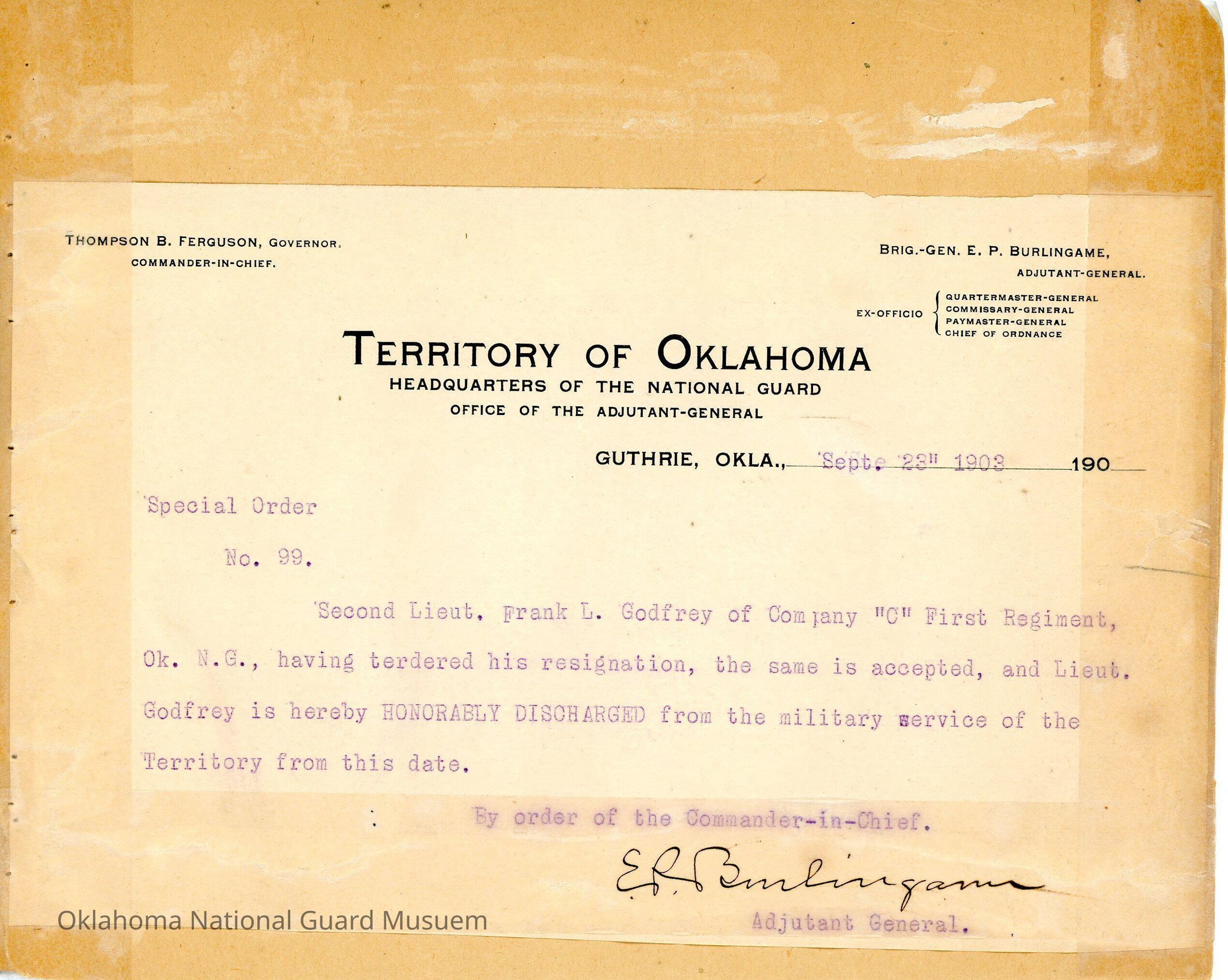 Adjutant General, Guthrie, E.P. Burlingame, Thompson B. Ferguson, First Regiment, Frank L. Godfrey