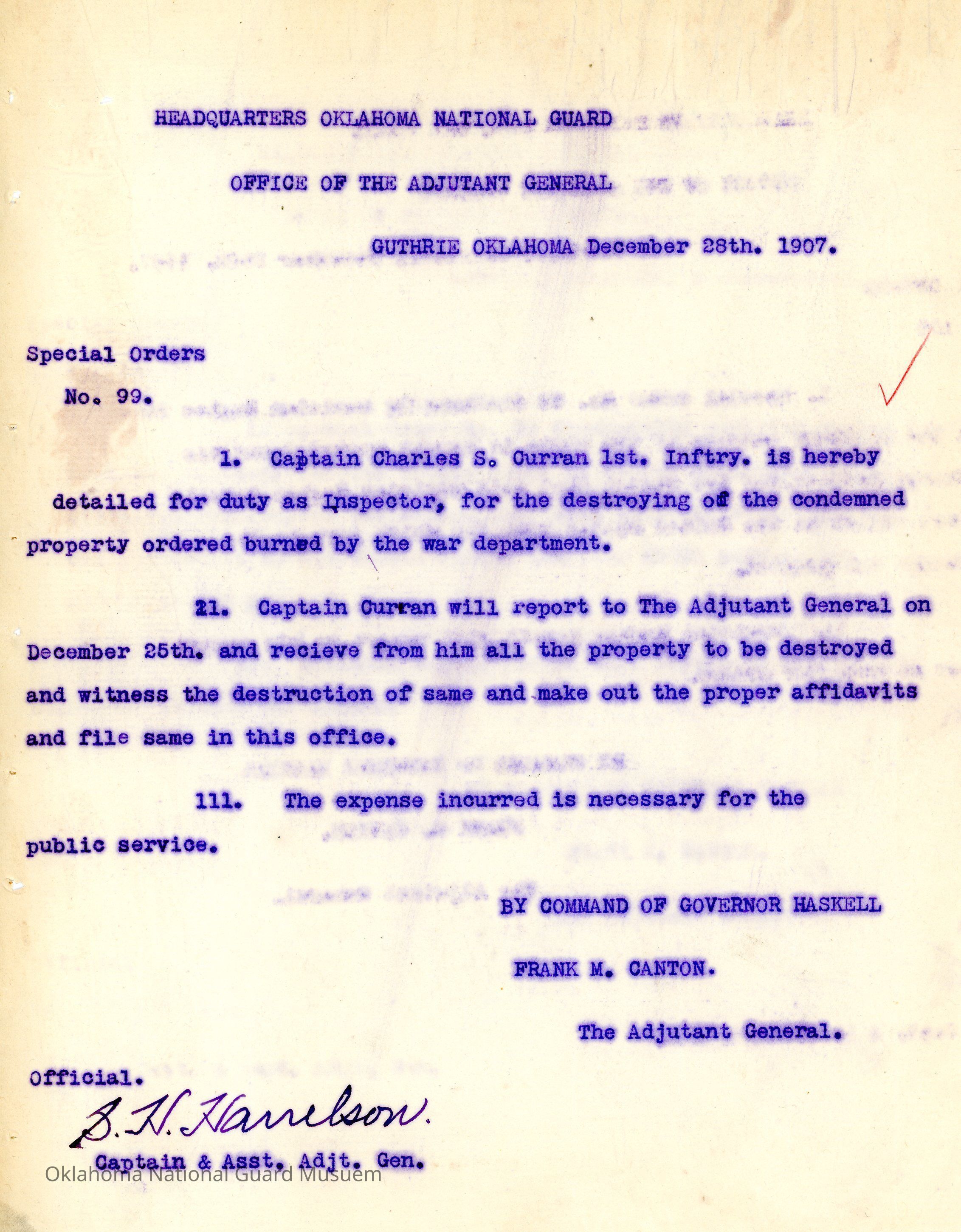 Special Order #99 from Headquarters Adjutant General's Office in Guthrie. The order appoints Charles S. Curran as Inspector for destroying condemned propertyDate(s) of Creation