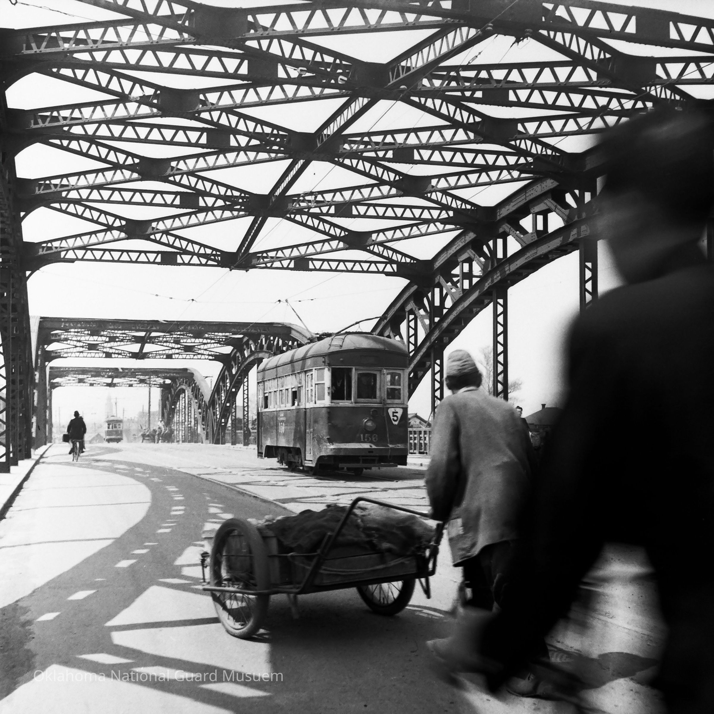 Negative of a streetcar crossing bridge