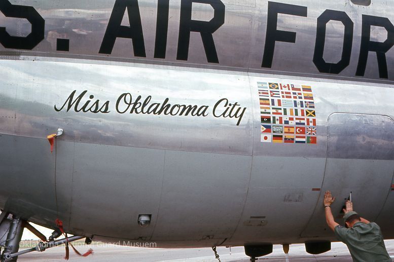 "Miss Oklahoma City" painted fuselage panel on the Talking Bird. Flags painted on the side showing all the countries Talking Bird flew to