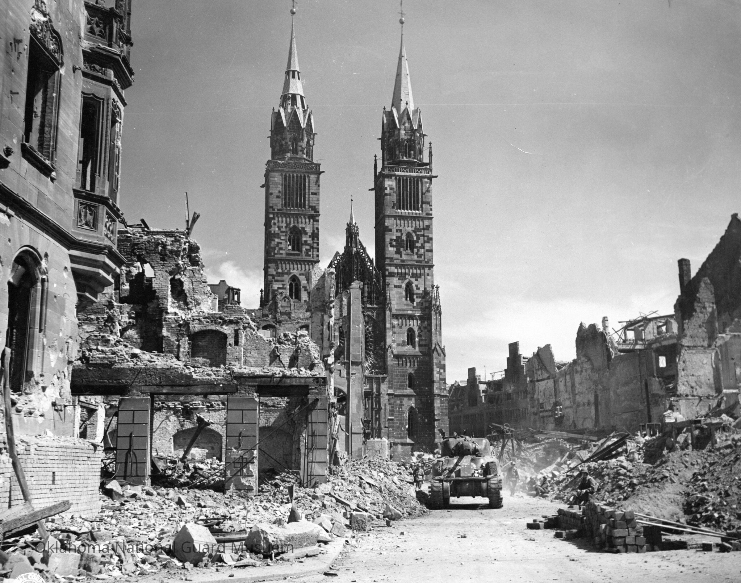 Tank in a rubble covered street helping flush out snipers. 180th Infantry