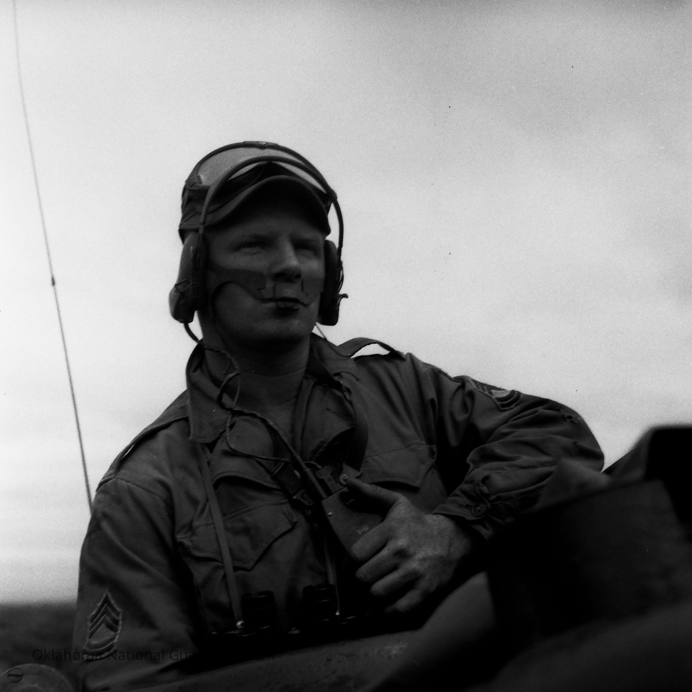 Negative of a tank commander seated in turret