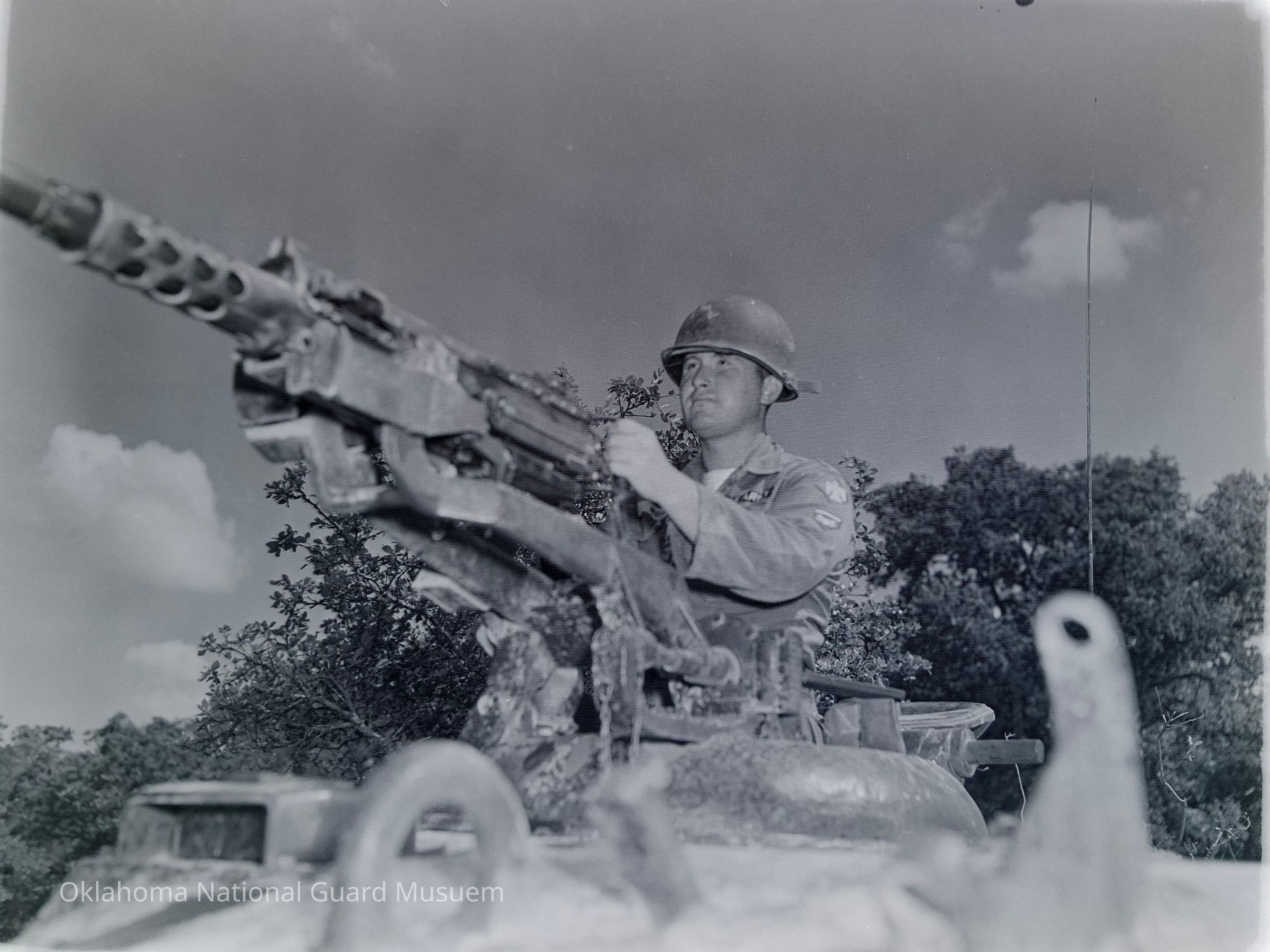 Negative of a tank crewman manning 50-caliber machine gun. 245th Tank Battalion