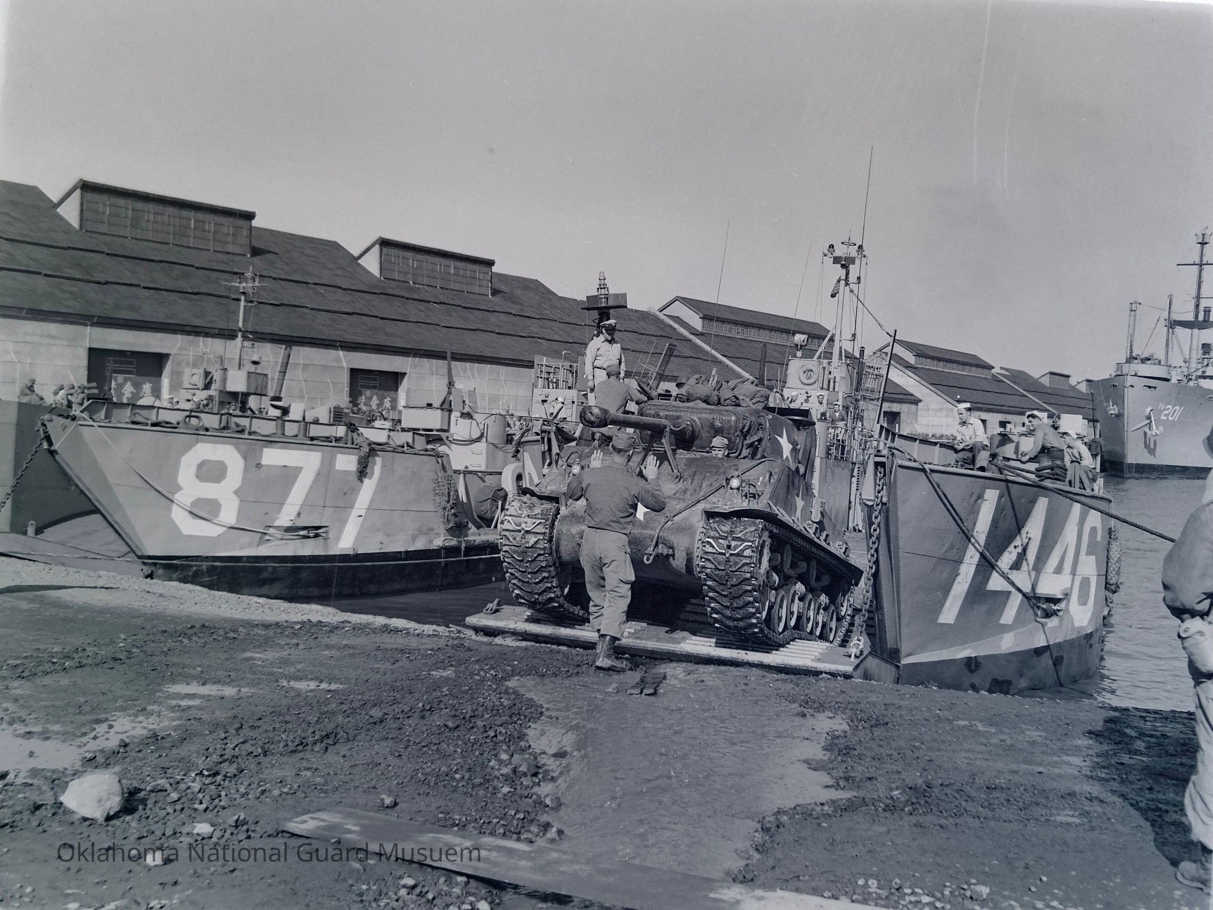 Negative of a tank driving off of a beach landing craft on Hokkaido, Japan