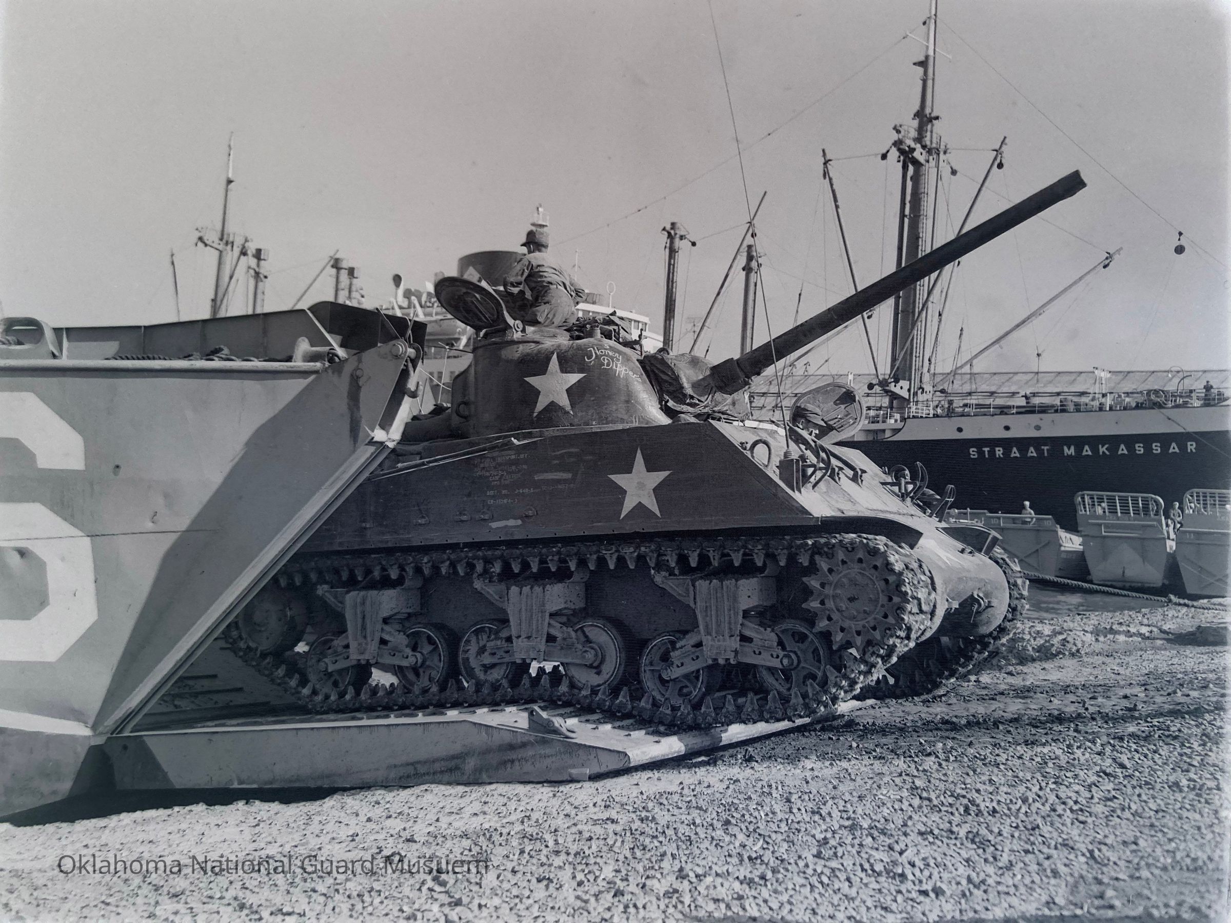 Tank driving off of a beach landing craft
