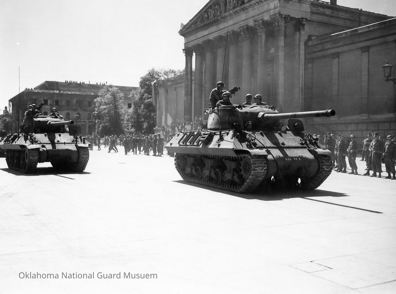 Tanks of the 645th Tank Destroyer Battalion pass in review during the Memorial Day service