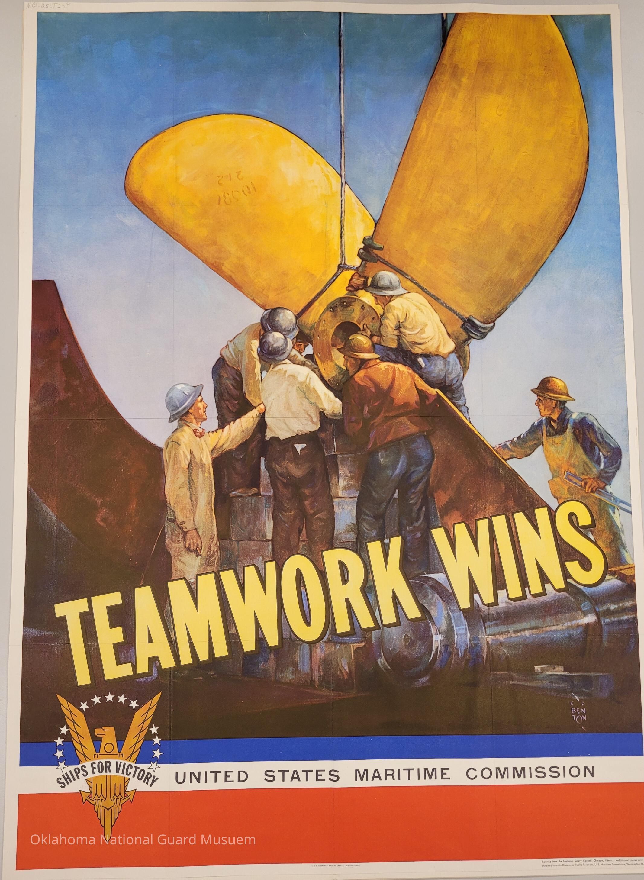 Workers building a propeller for a ship. Ships for victory emblem in lower left cornerCollection