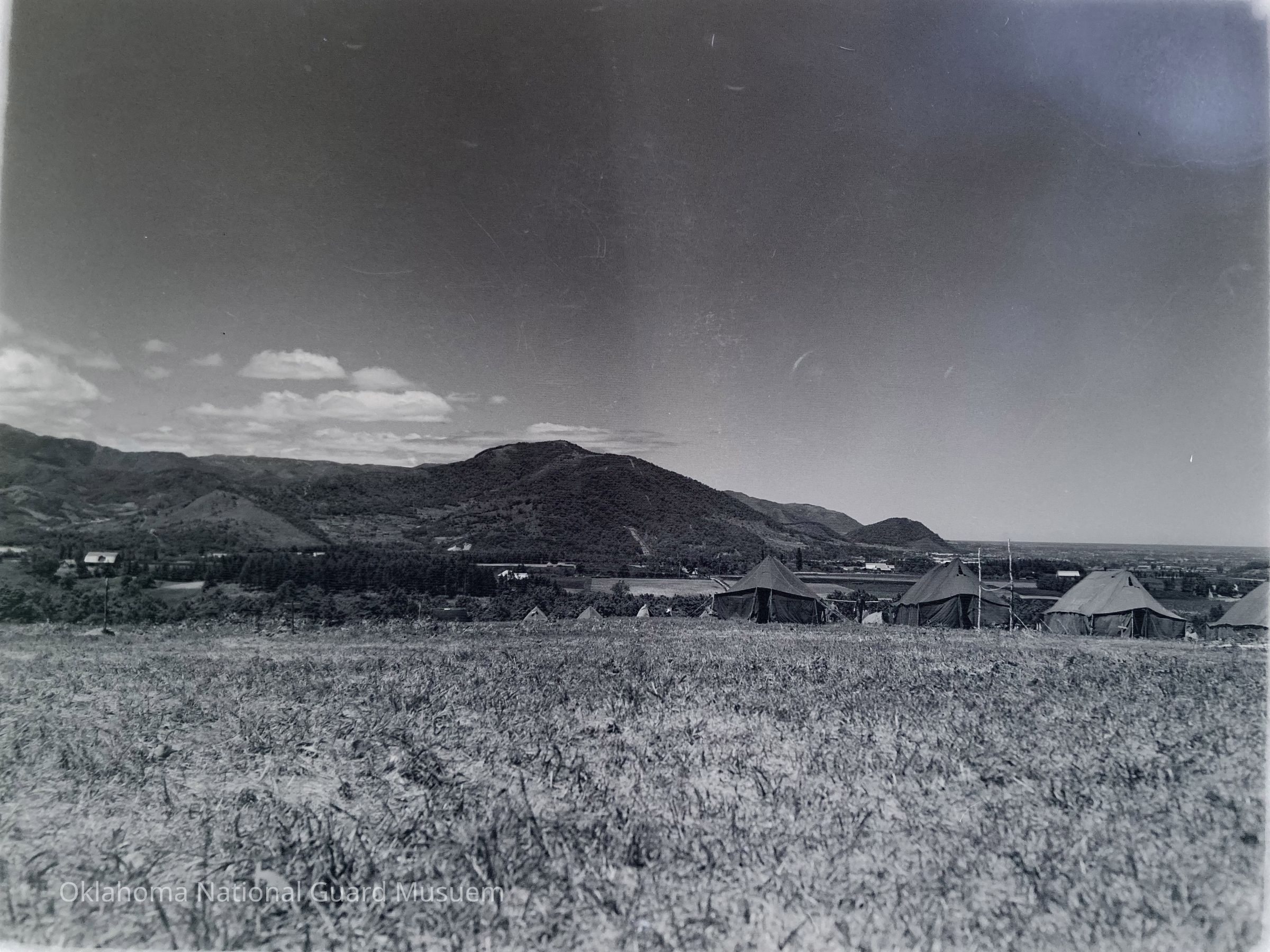 Negative of a tent camp with mountains in the background on Hokkaido, Japan