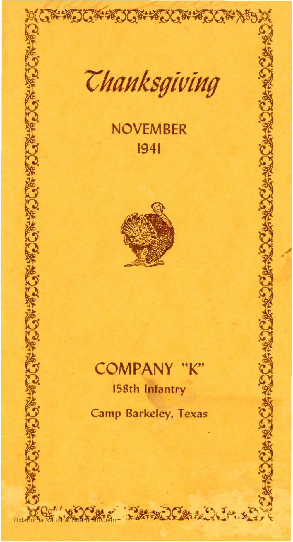 Thanksgiving menu and roster Company K 158th Infantry with signatures on the back