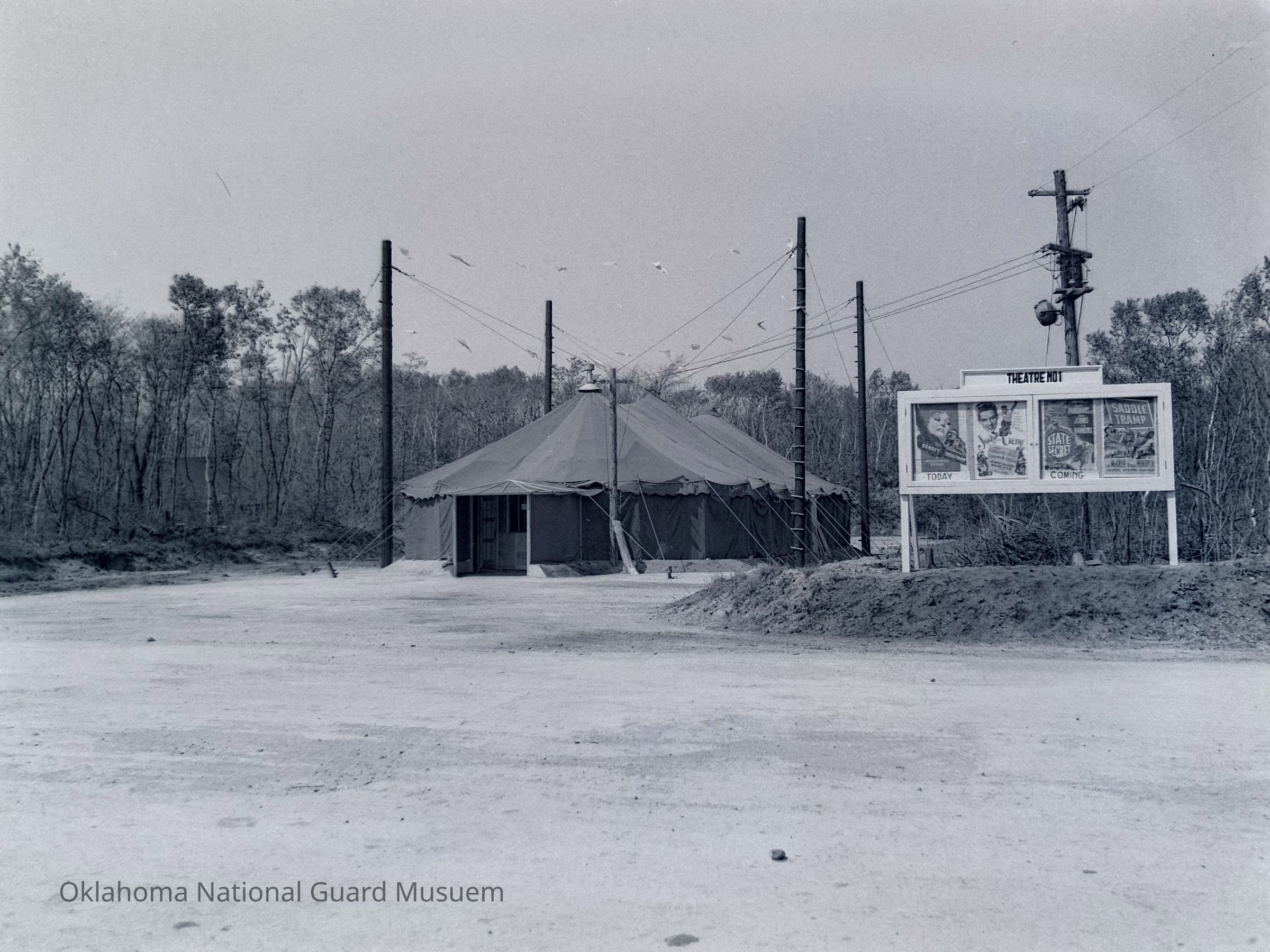 Negative of a theater marquee in front of large tent on Hokkaido, Japan
