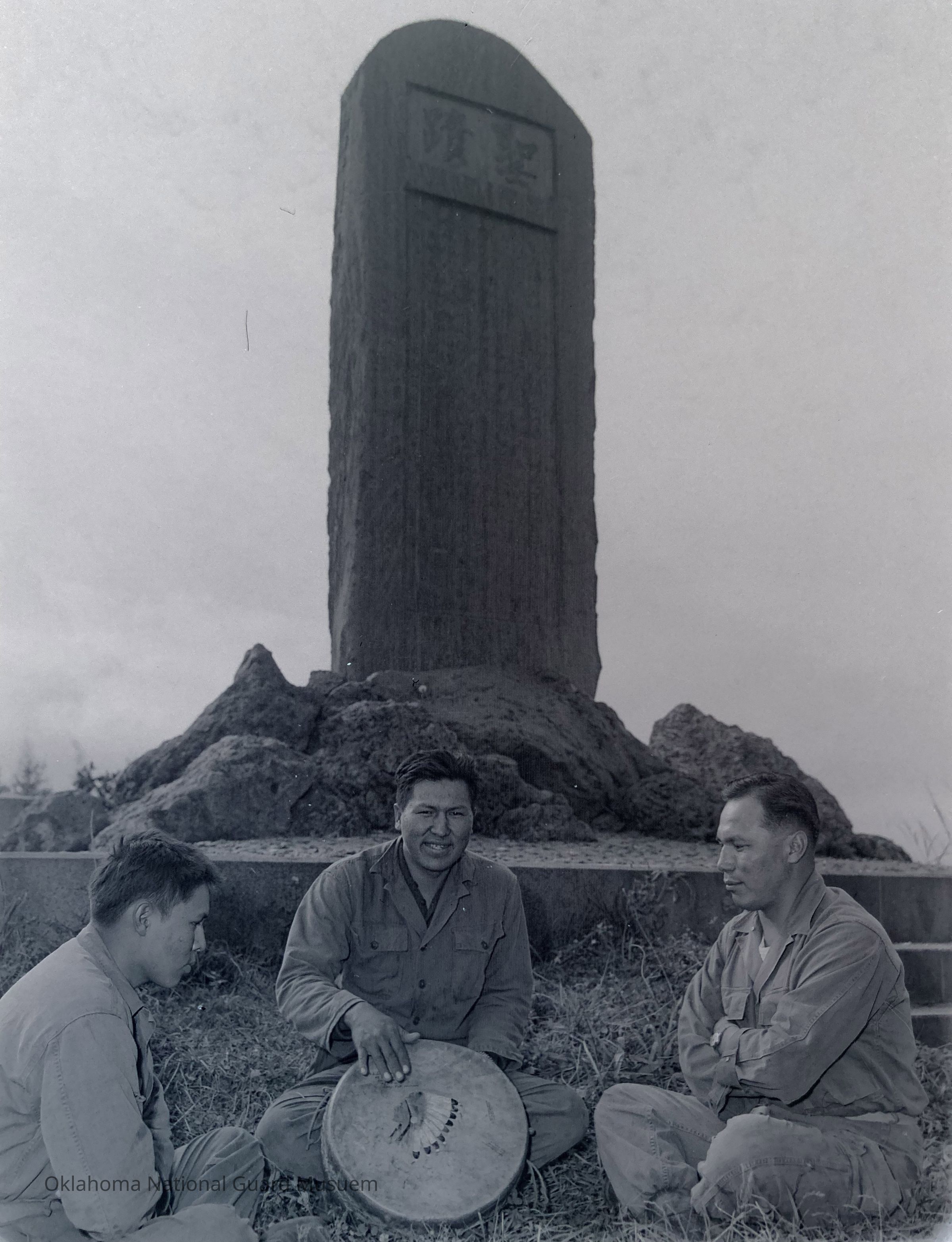 Three Native American soldiers with a drum sit in front a large stone obelisk
