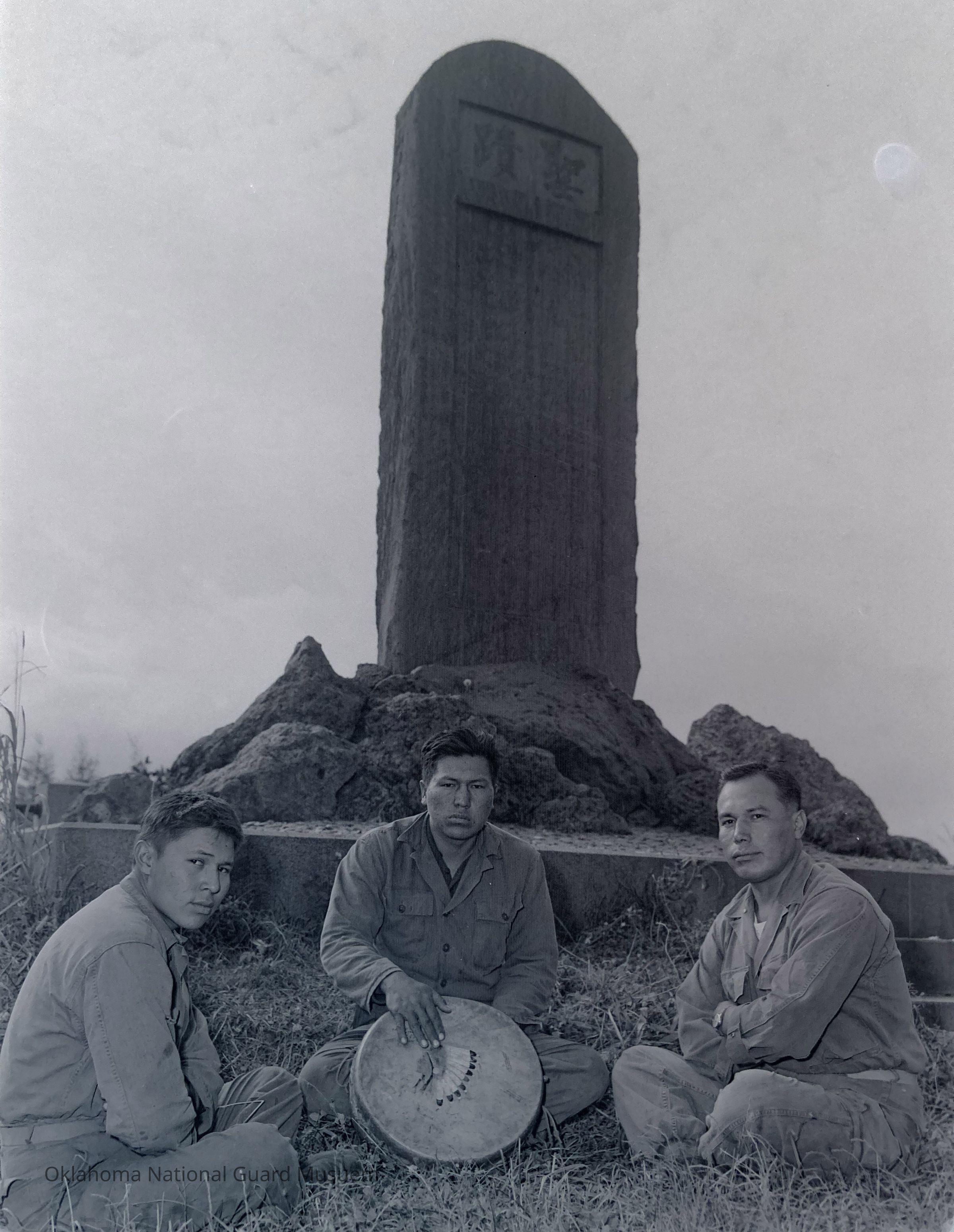 Negative of three Native American soldiers with a drum sit in front a large stone obelisk on Hokkaido, Japan