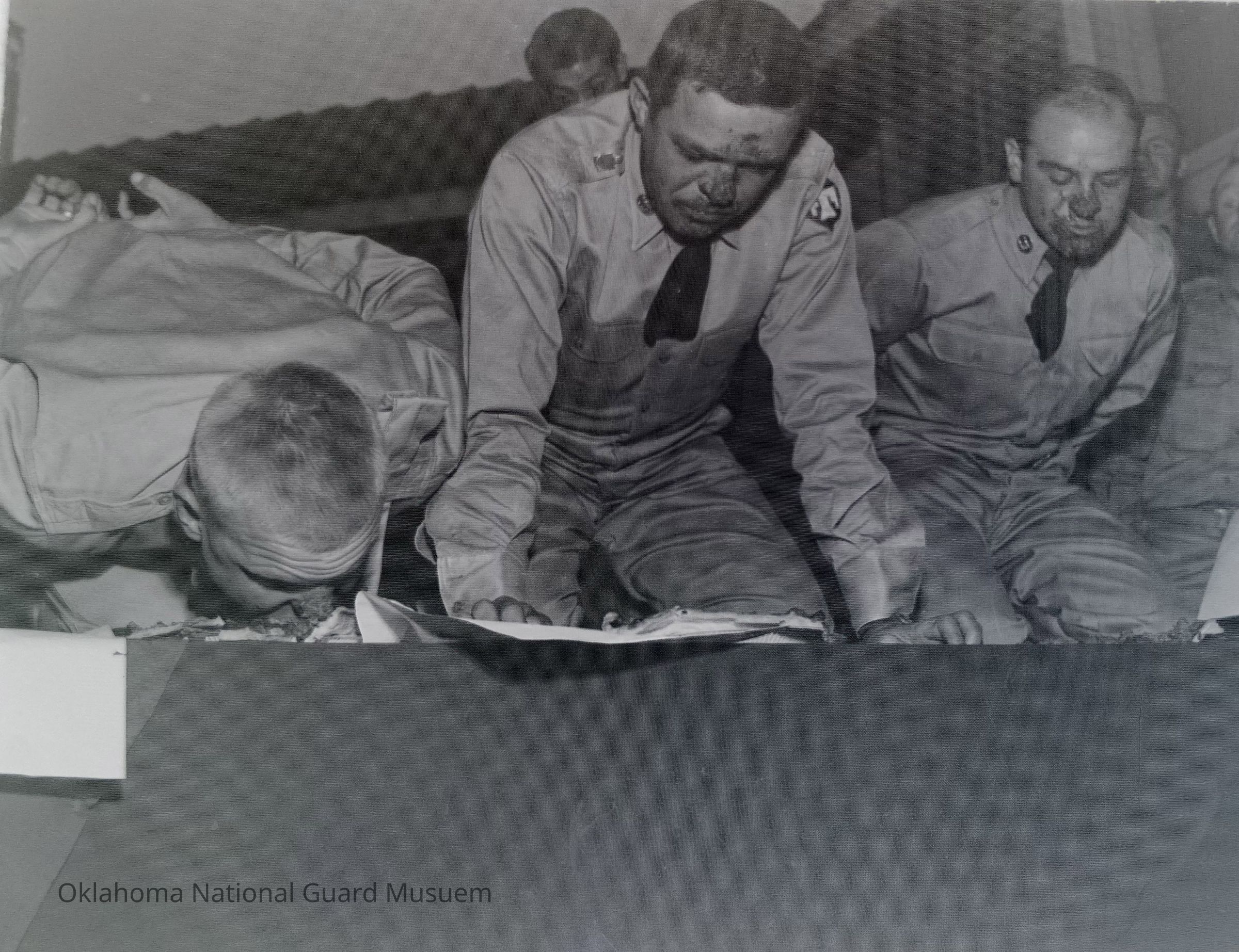 Negative of three soldiers in a pie eating contest on Hokkaido, Japan
