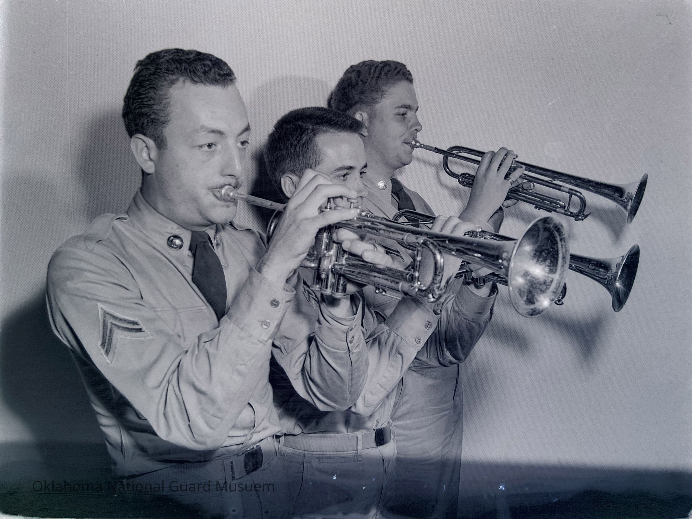 Negative of three soldiers playing trumpets at Camp Crawford. 45th Infantry Band