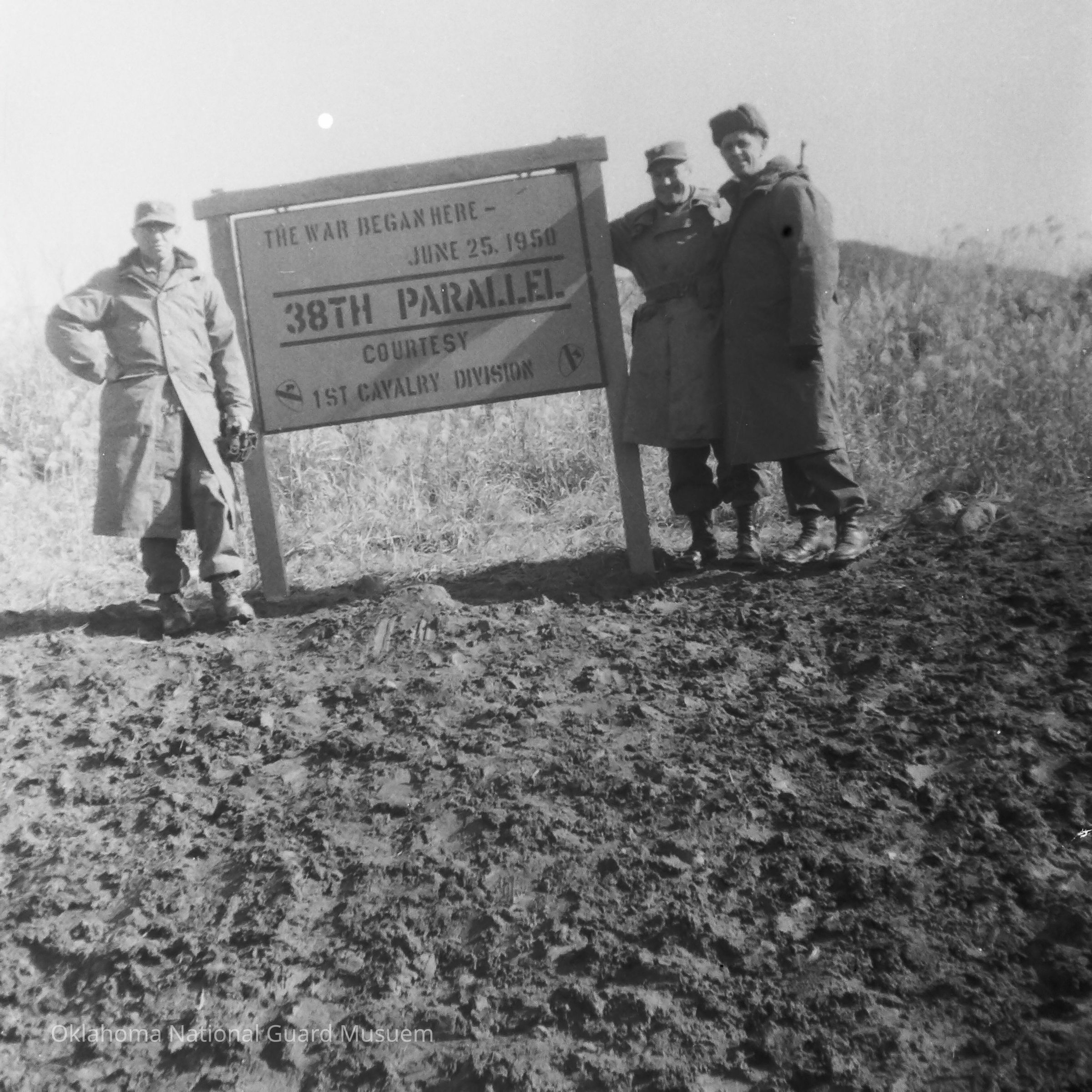 Negative of three soldiers standing around a sign for the 38th Parallel