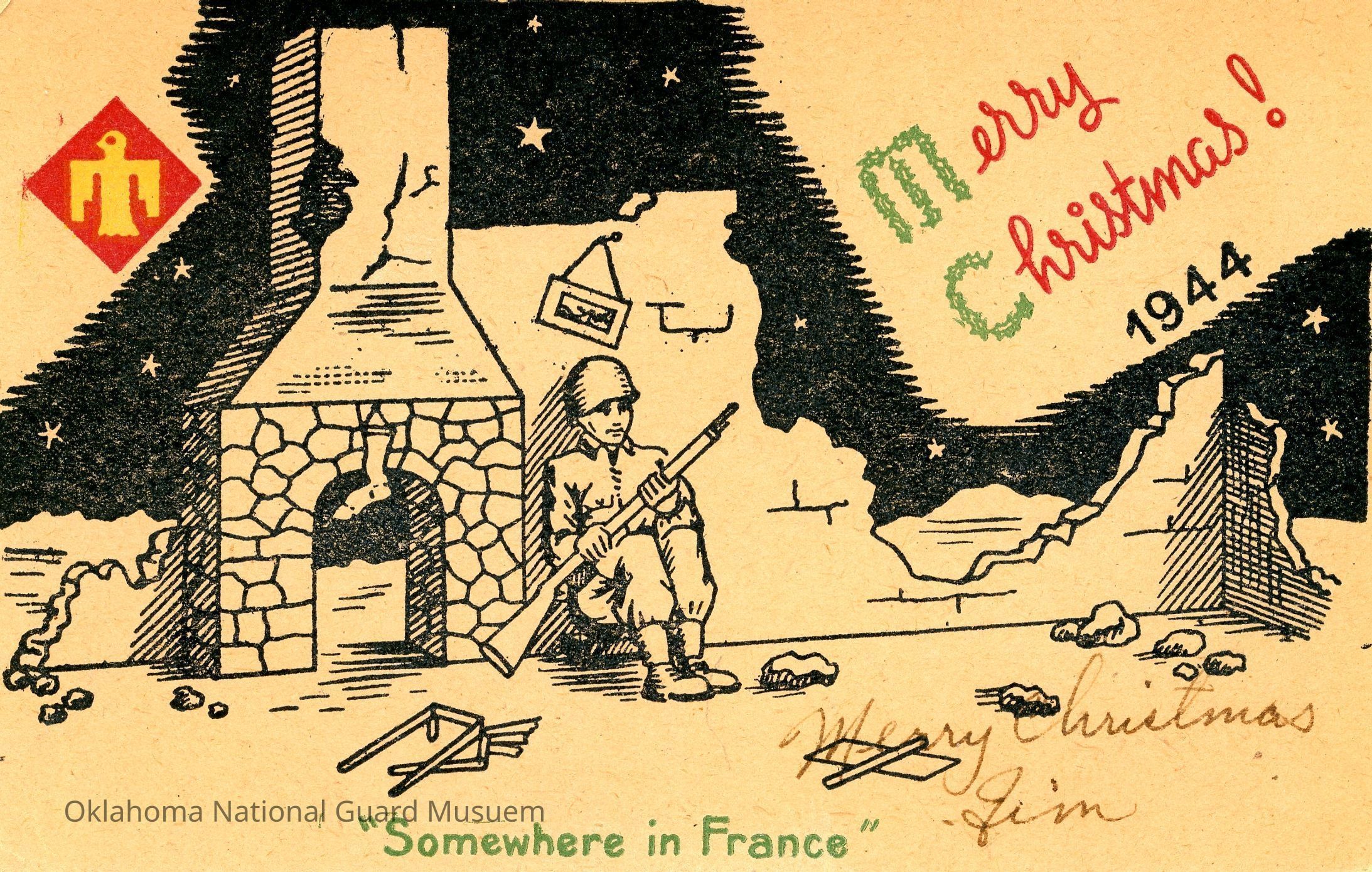 Christmas card showing a soldier in a destroyed house next to a fireplace clutching his rifle. "Merry Christmas- Jim" is written in the lower right corner