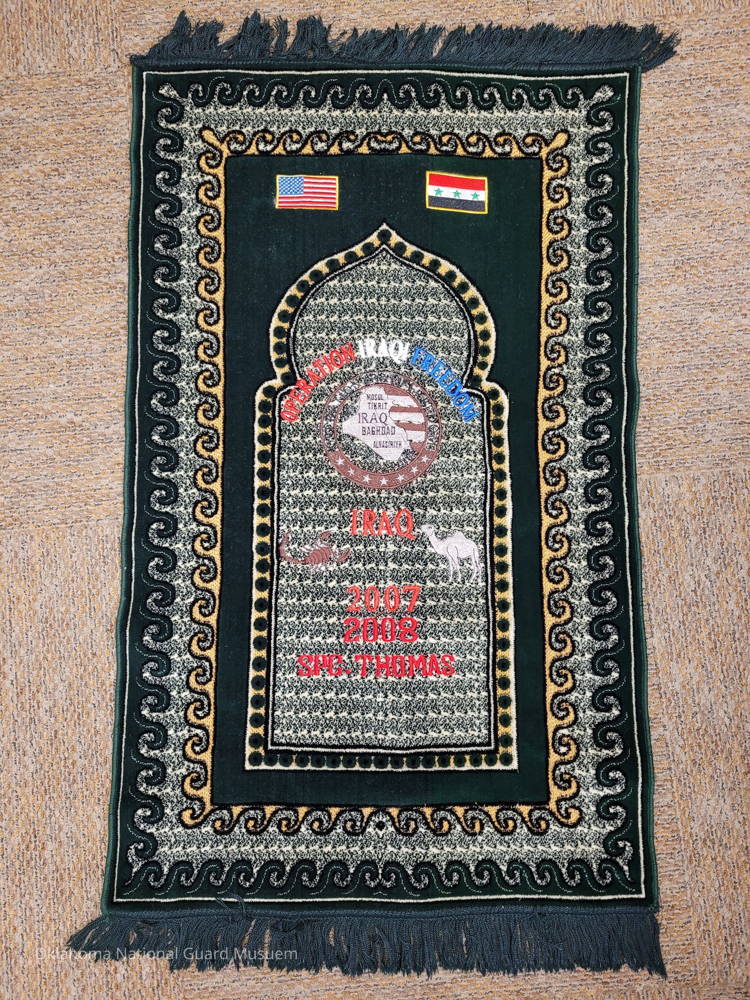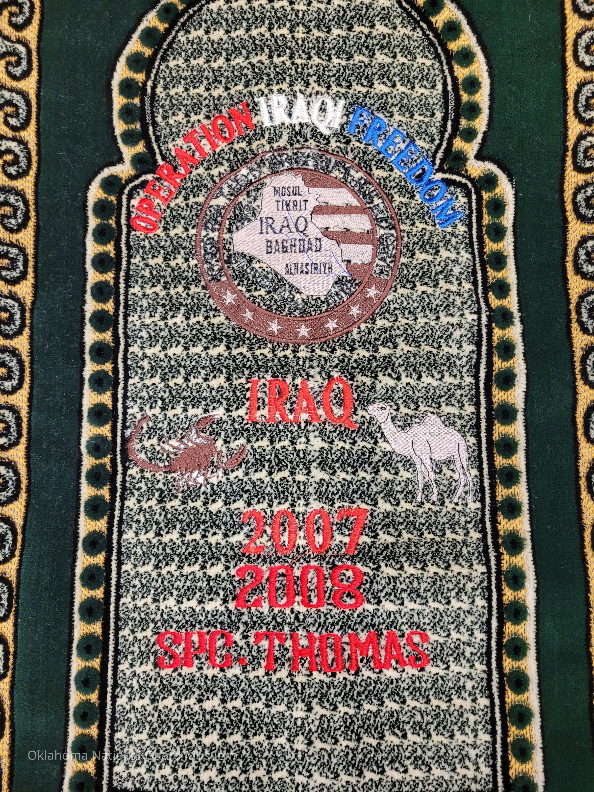 Tourist Tapestry Prayer Rug Souvenir from Operation Iraqi Freedom. Spc. Thomas' name at the bottom. Map of Iraq in the center with a camel and scorpion