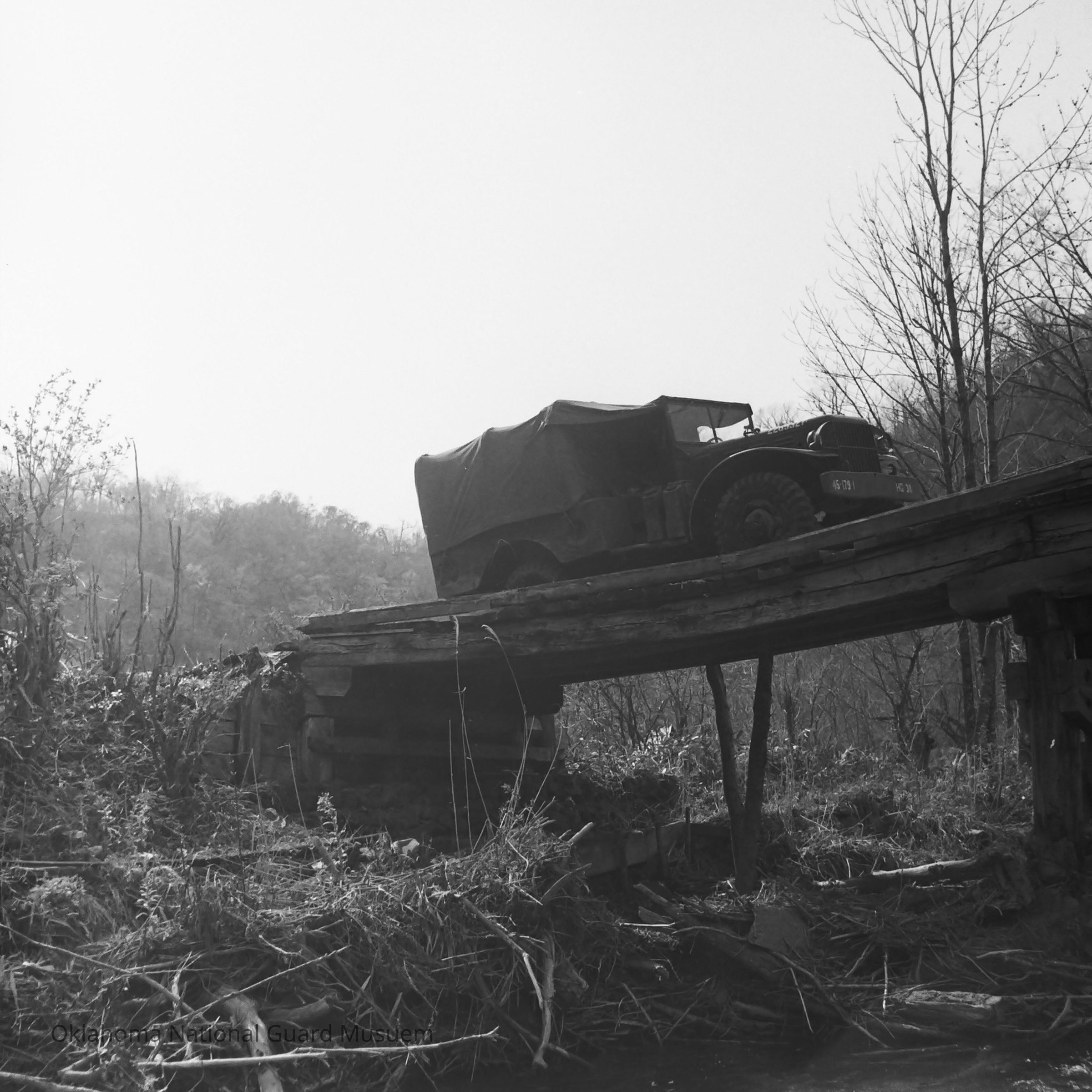 Negative of a truck broken through a wooden bridge. 179th Infantry