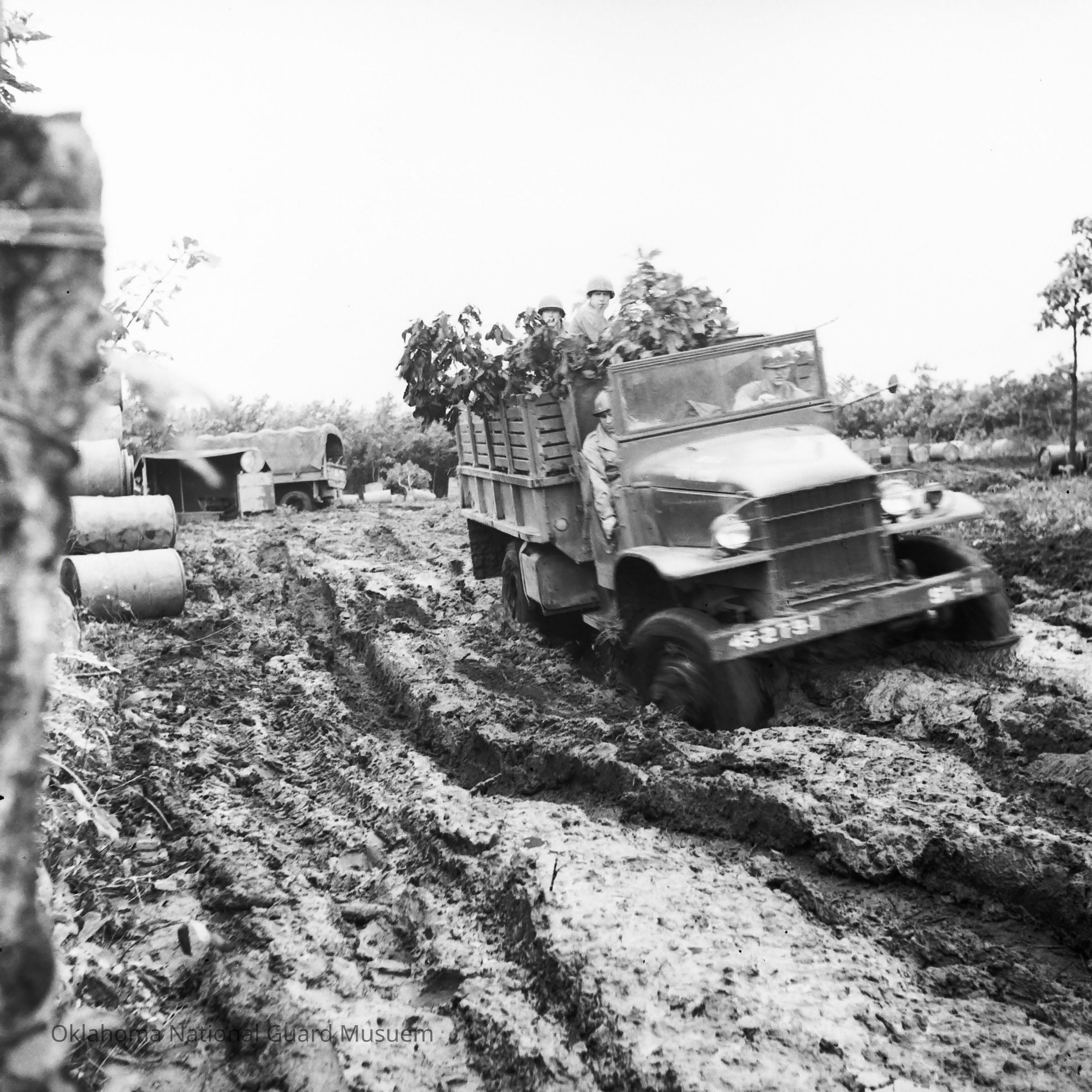 Truck carrying soldiers through deep mud