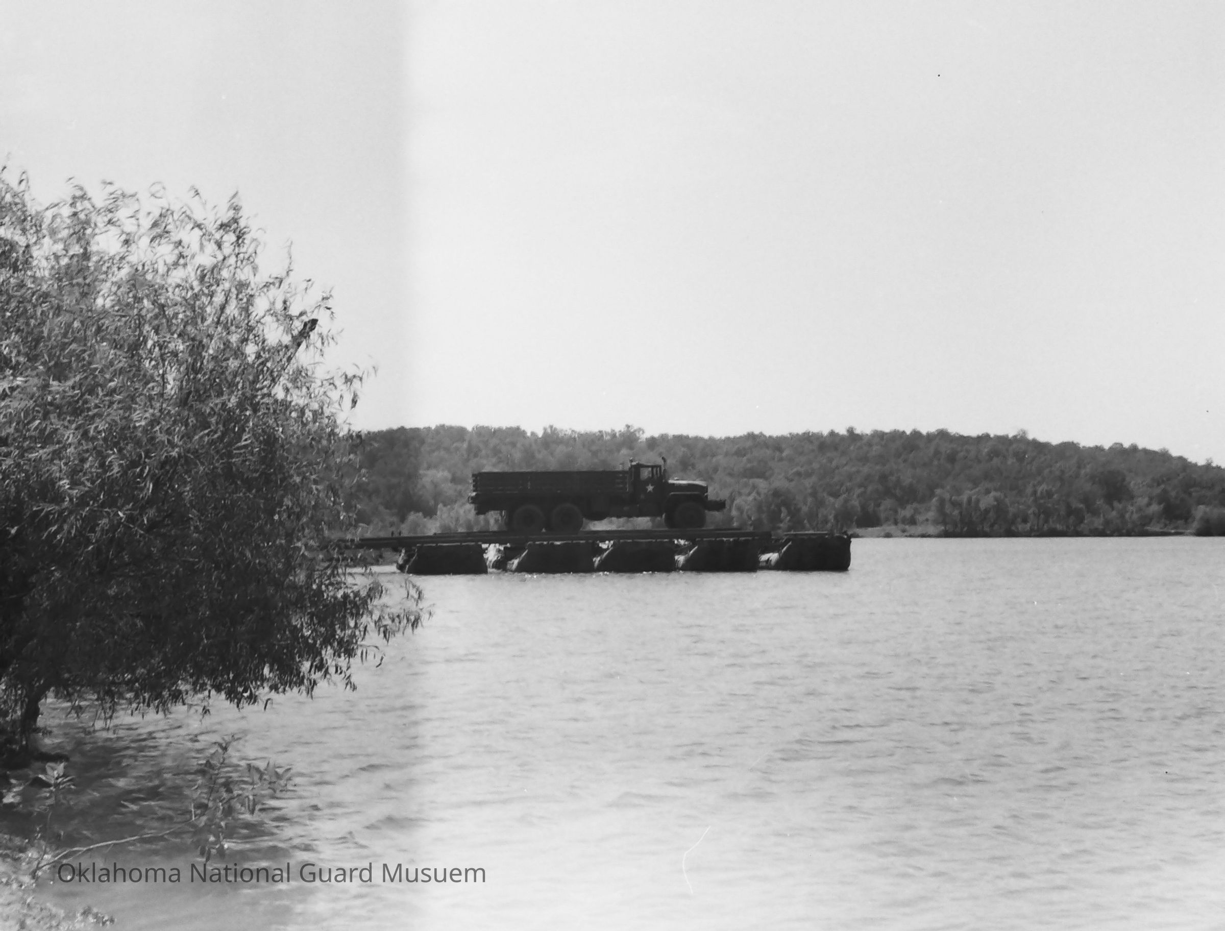 Negative of a truck parked on pontoon bridge section. 120th Engineers