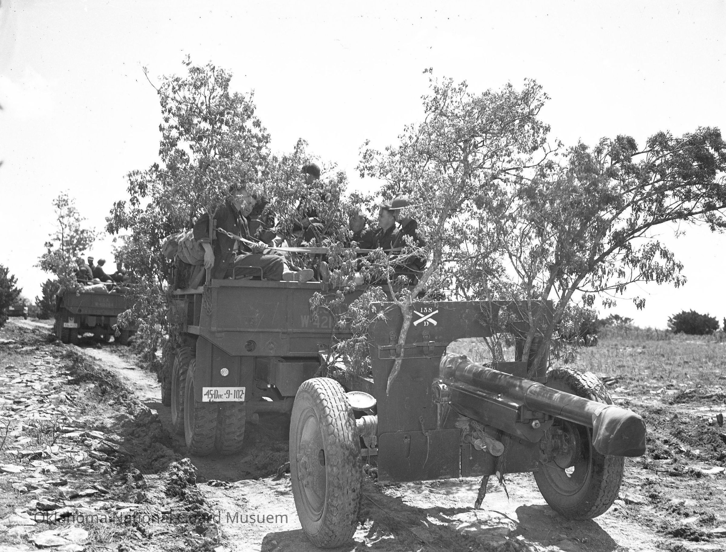 Negative of a truck pulling artillery piece. 158th Field Artillery Battery D
