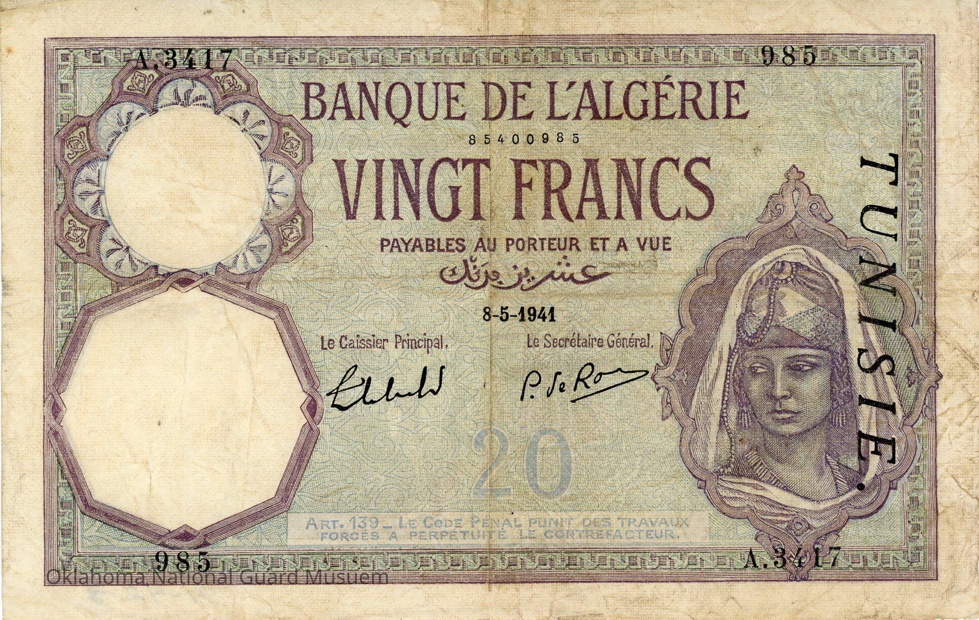 Tunisian Twenty Francs-1941. Stamped "Tunisie" on obverse. Accession number written on reverse in lower right corner