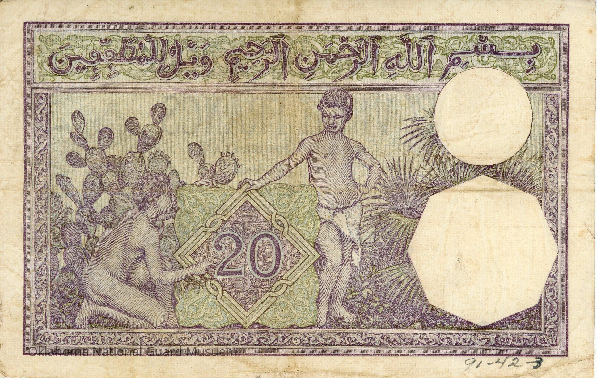 Frame decorated with Arabic patterns with an inscription in Arabic in a pediment at the top. In the middle, two young boys, one kneeling and the other standing, frame a medallion with decorated rhombus and containing the value "20" printed in purple. In the background, a prickly pear and a dwarf palm.