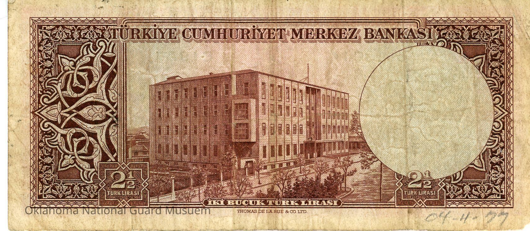 Turkish Two and a Half Lira-1955. Accession number written on reverse in lower right corner