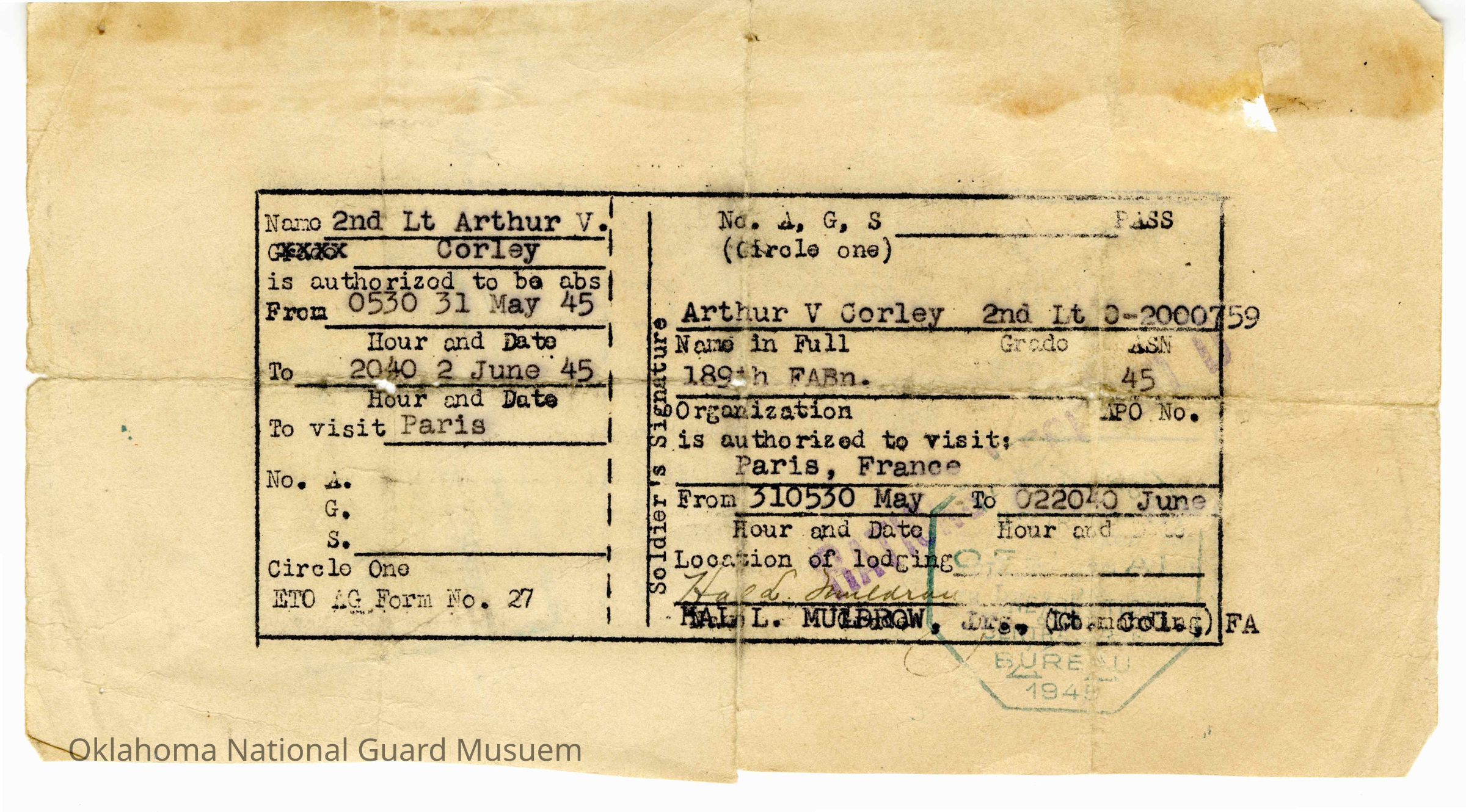 Two day pass for Arthur V. Corley, 189th Field Artillery, to visit Paris. Signed by Hal L. Muldrow