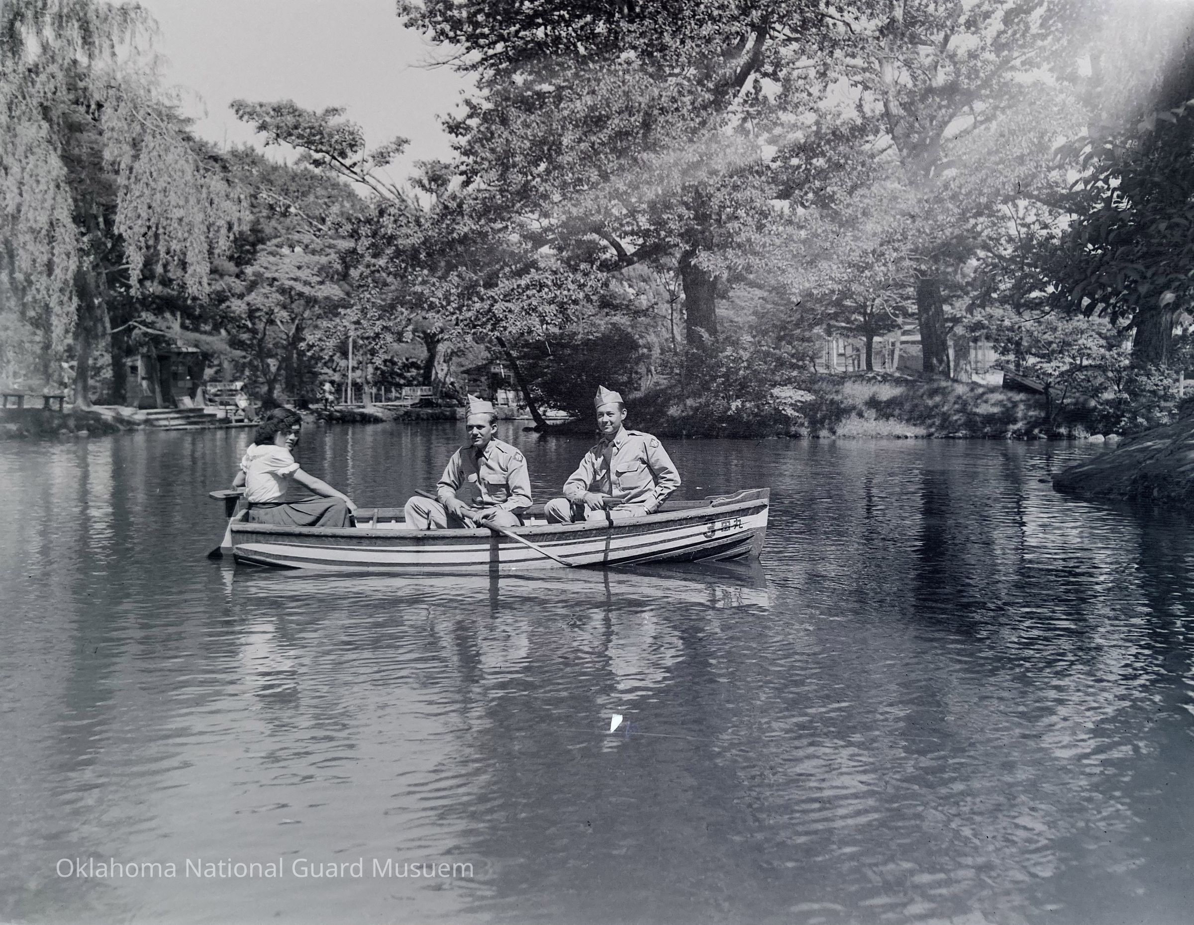 Negative of two soldiers and a civilian woman in a rowboat on Hokkaido, Japan