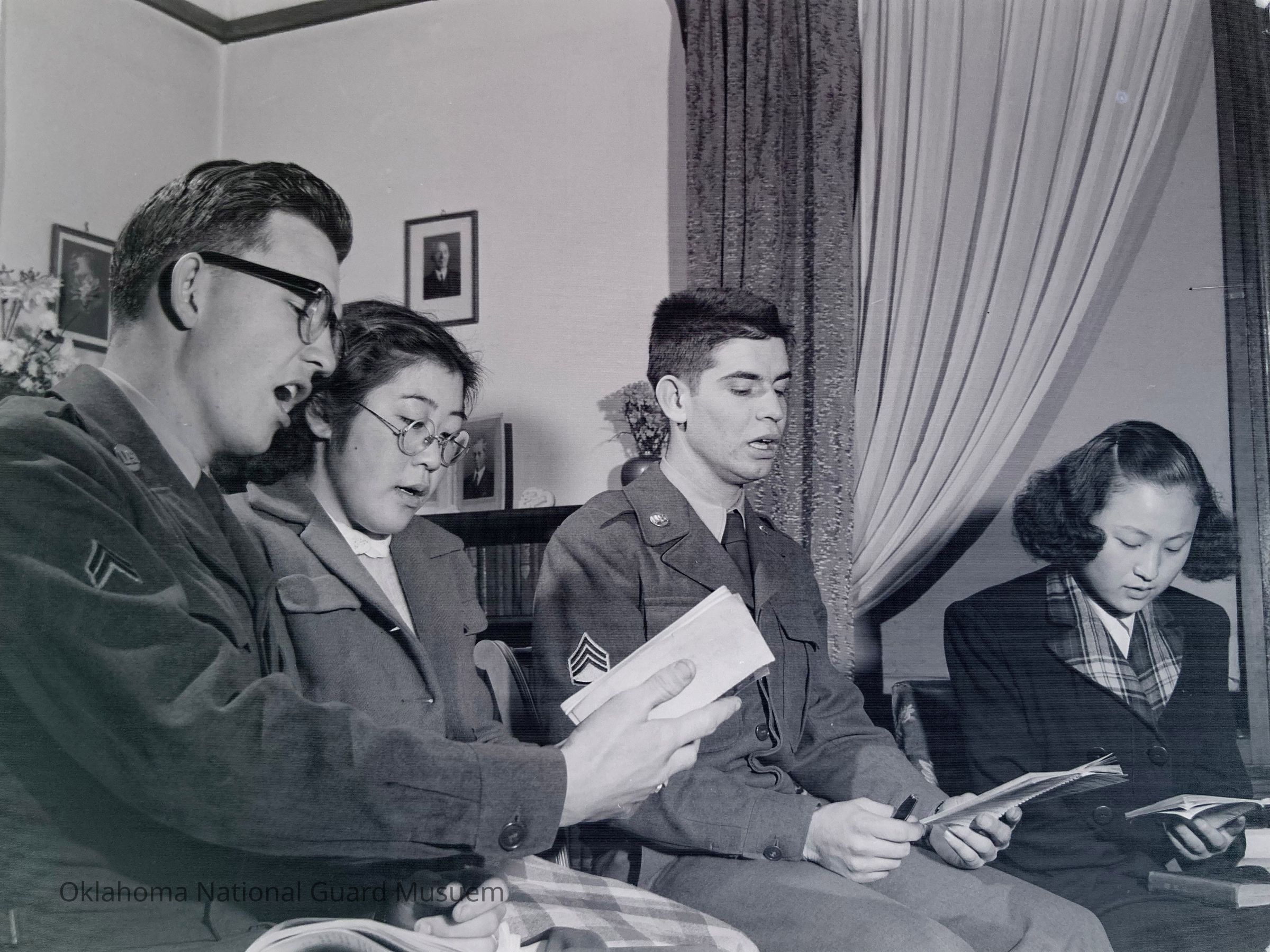 Two soldiers and two Japanese women singing together
