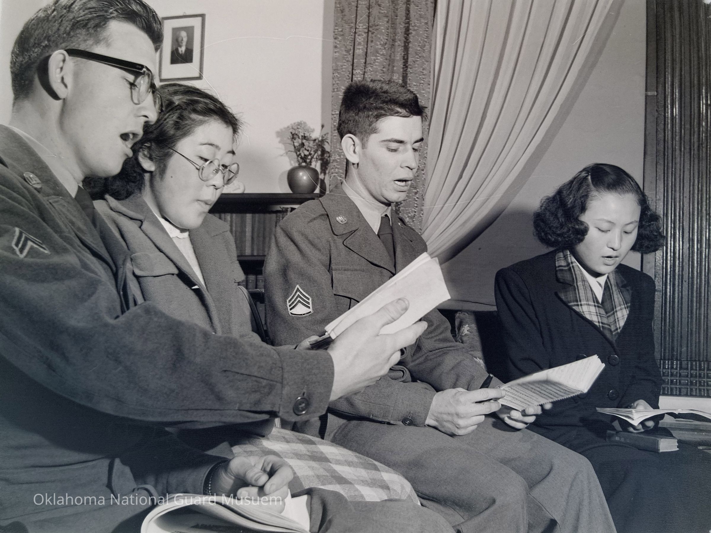 Negative of two soldiers and two Japanese women singing together on Hokkaido, Japan