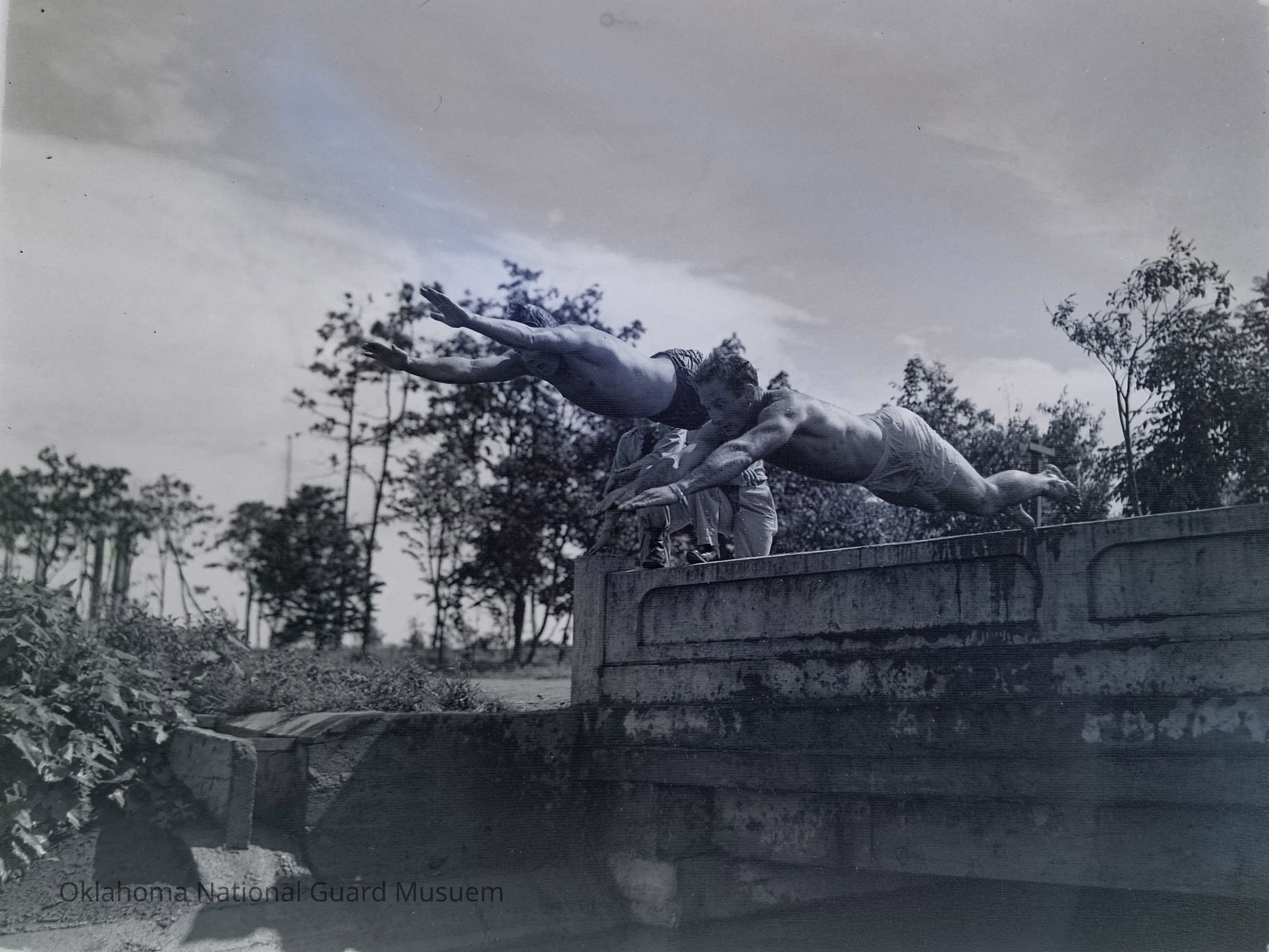 Two soldiers diving off a bridge