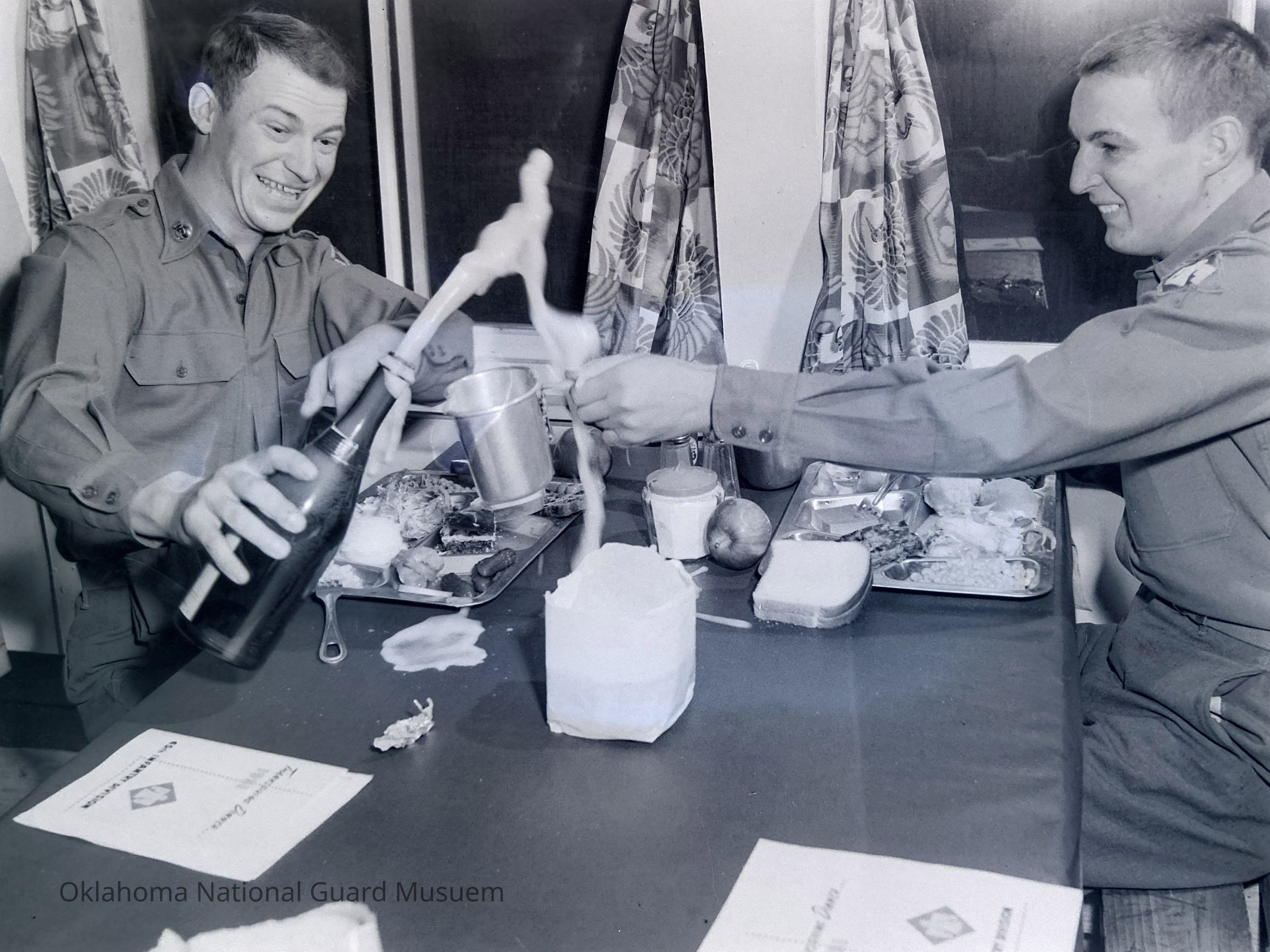 Negative of two soldiers drinking champagne in a mess hall on Hokkaido, Japan