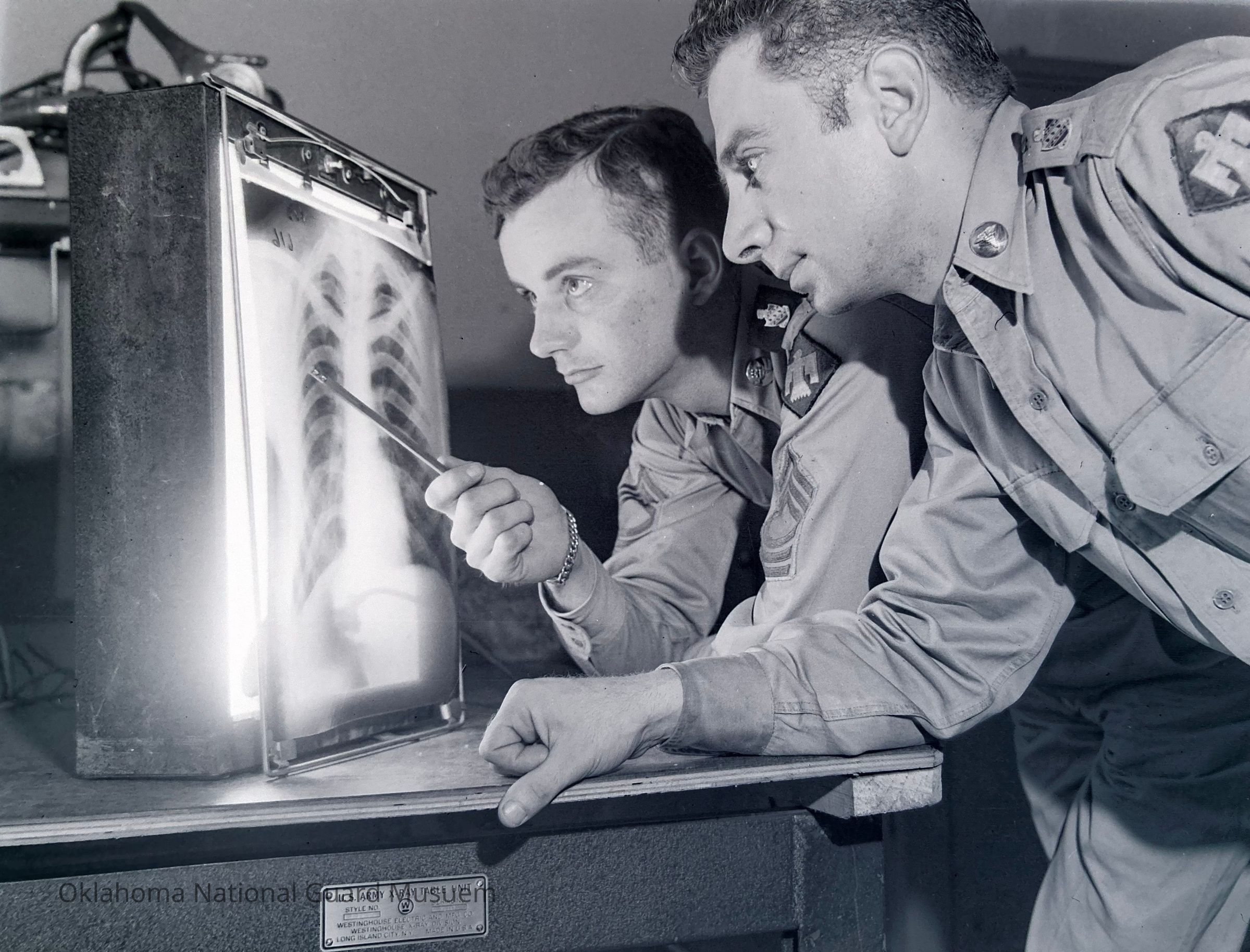 Negative of two soldiers examining a chest X-Ray. 120th Medical