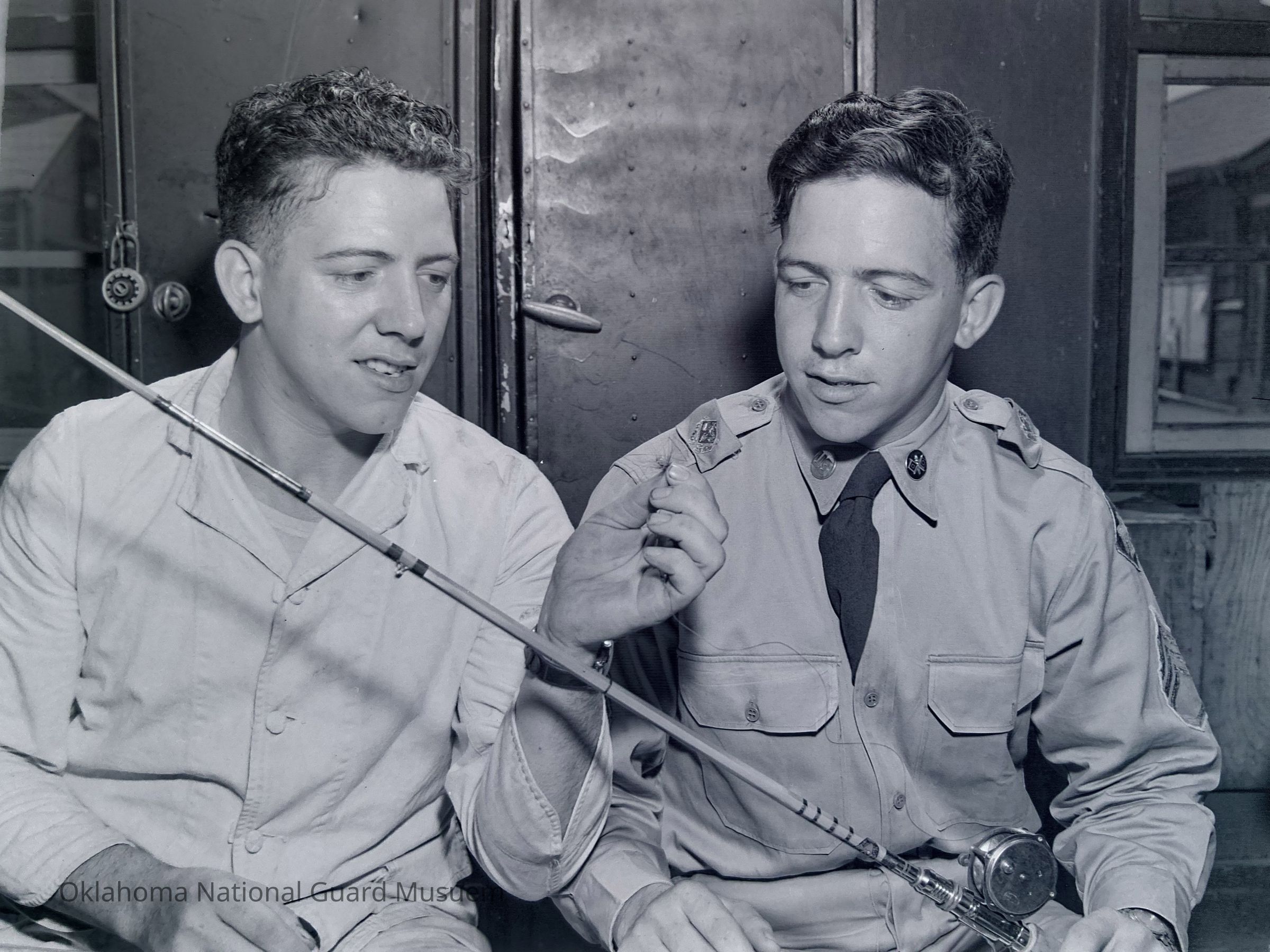 Two soldiers examining a fishing rod
