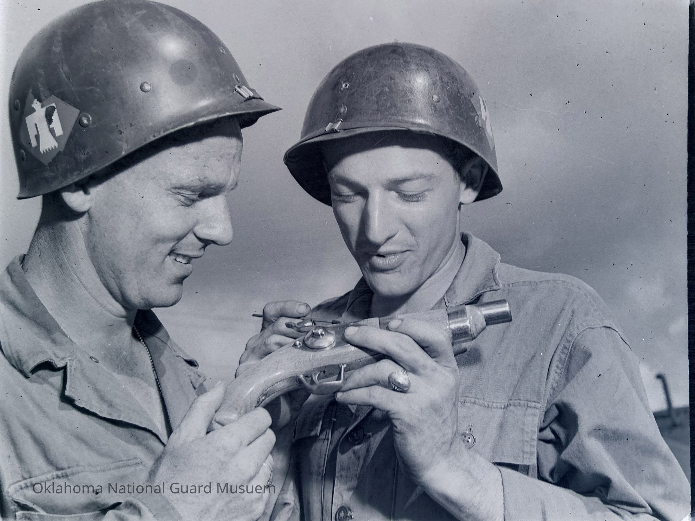 Negative of two soldiers examining an antique pistol on Hokkaido, Japan