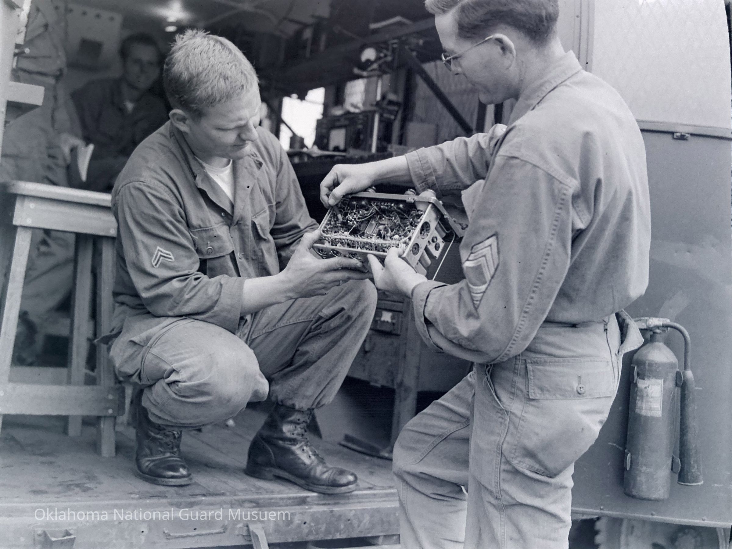 Negative of two soldiers examining an electronic device on Hokkaido, Japan