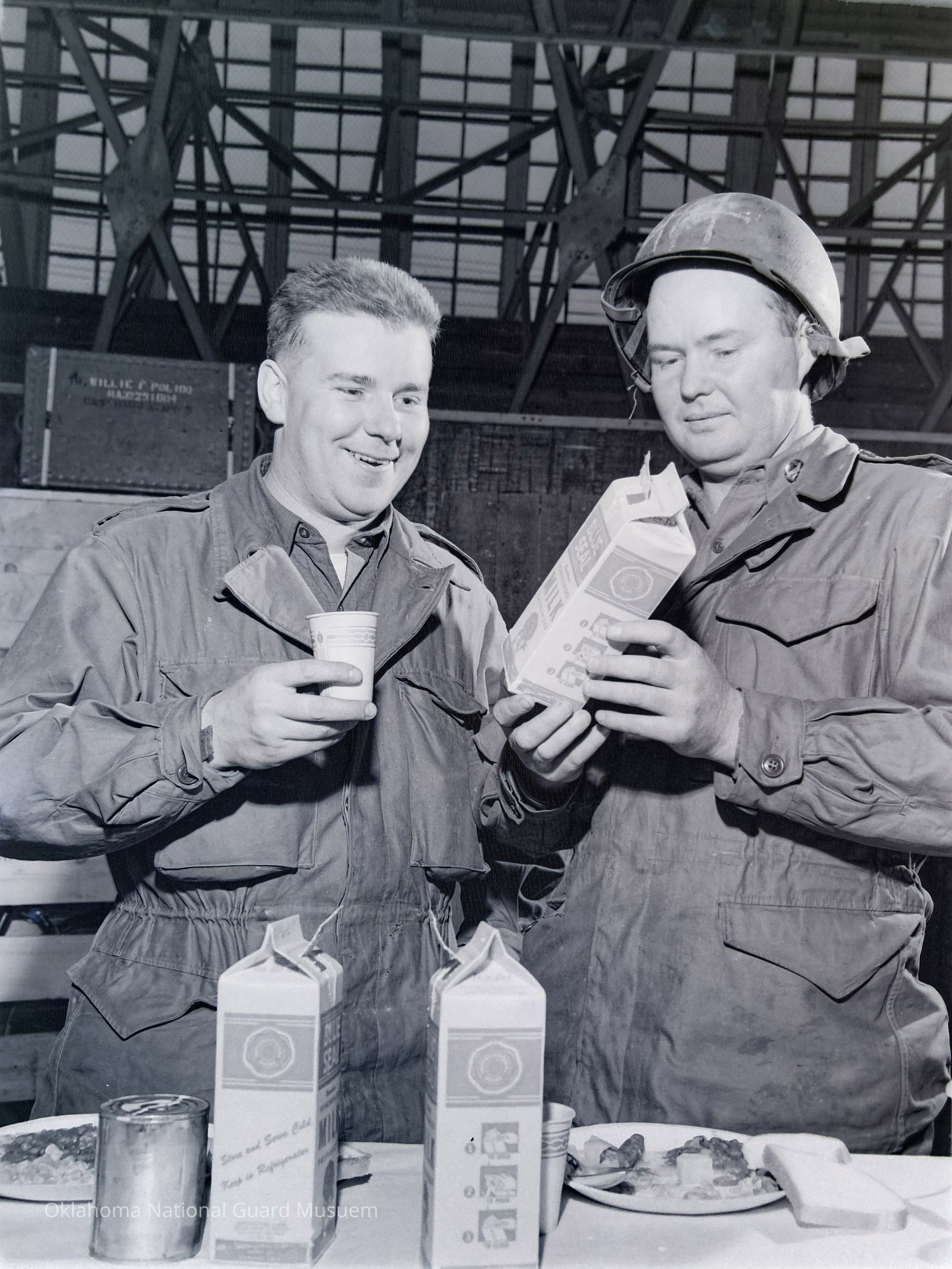 Negative of two soldiers examining milk cartons on Hokkaido, Japan