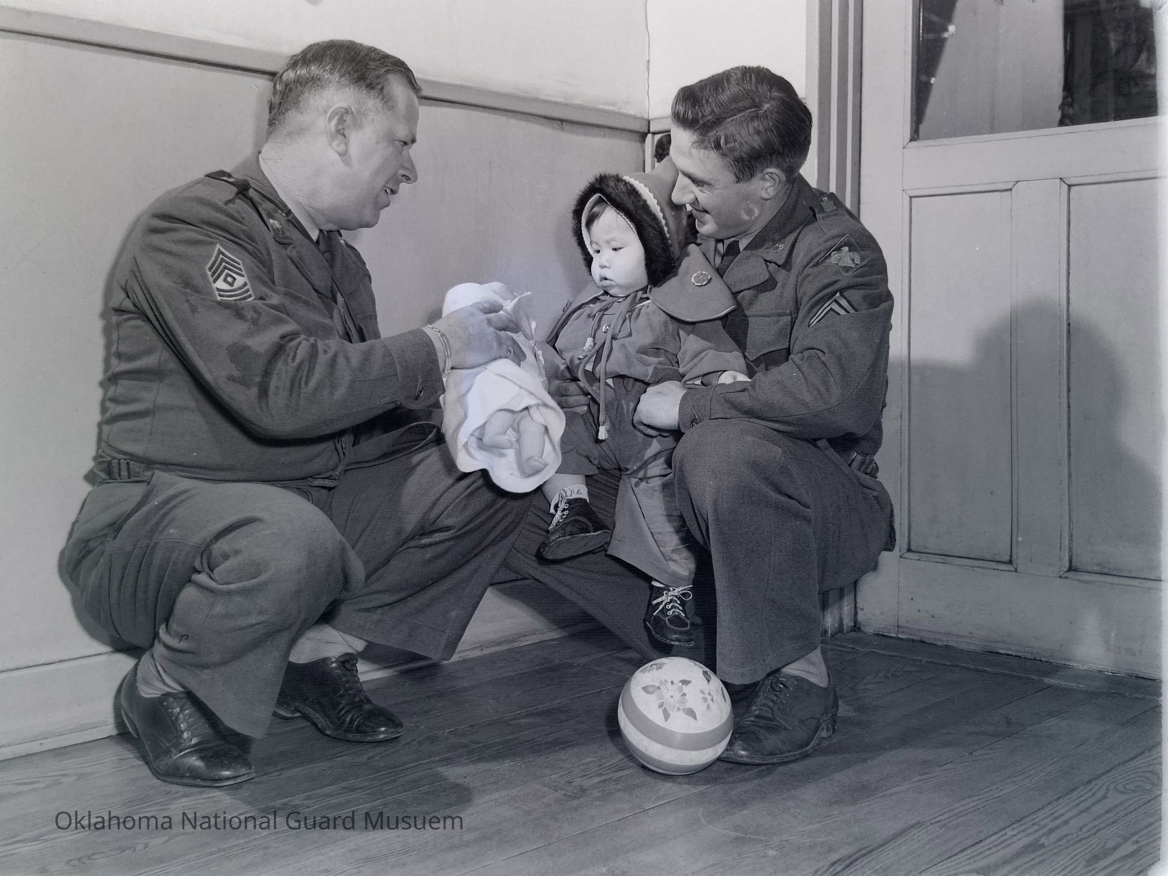 Two soldiers giving toys to a Japanese toddler
