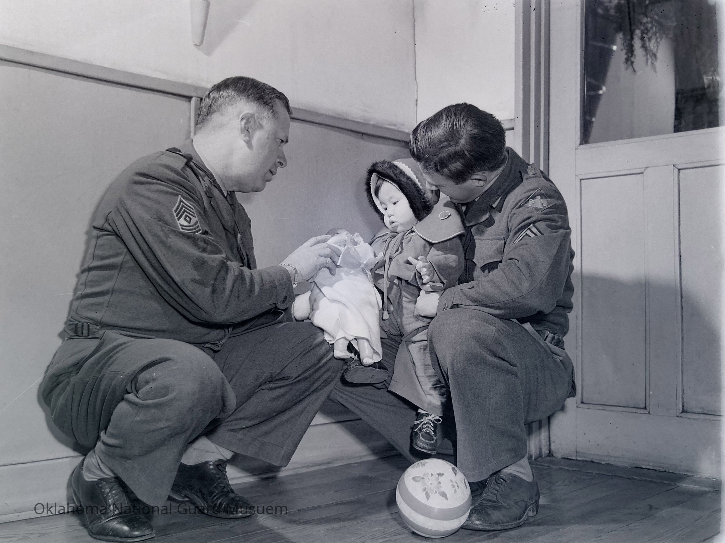 Negative of two soldiers giving toys to a Japanese toddler on Hokkaido, Japan
