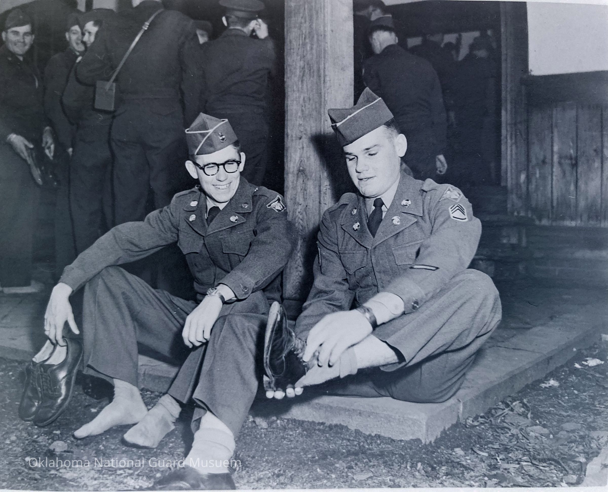 Negative of two soldiers in Class A uniforms sit and take their shoes off in Hokkaido, Japan