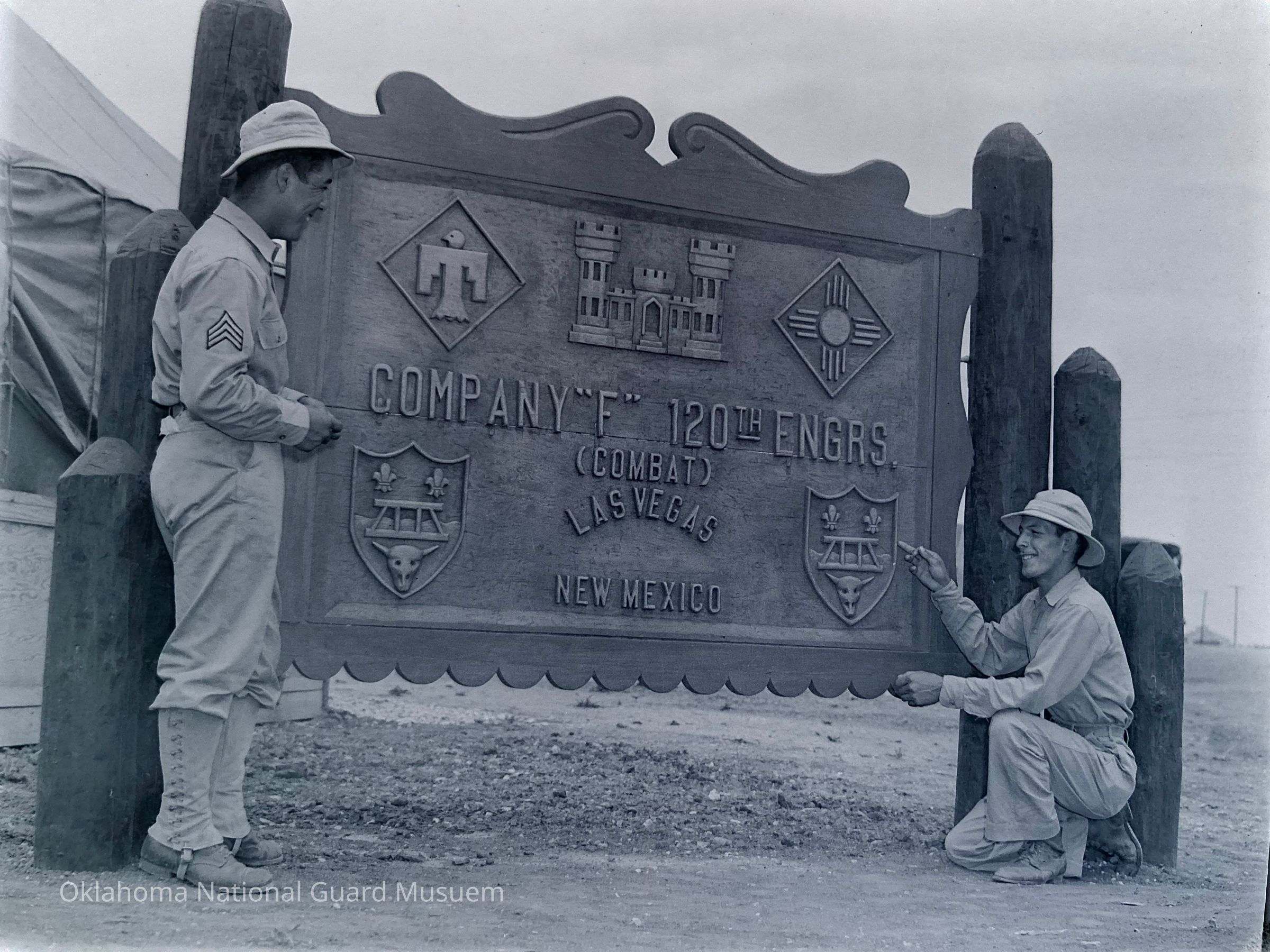 Negative of two soldiers in front of a large carved wood sign for Co F 120th Eng, Las Vegas, NM
