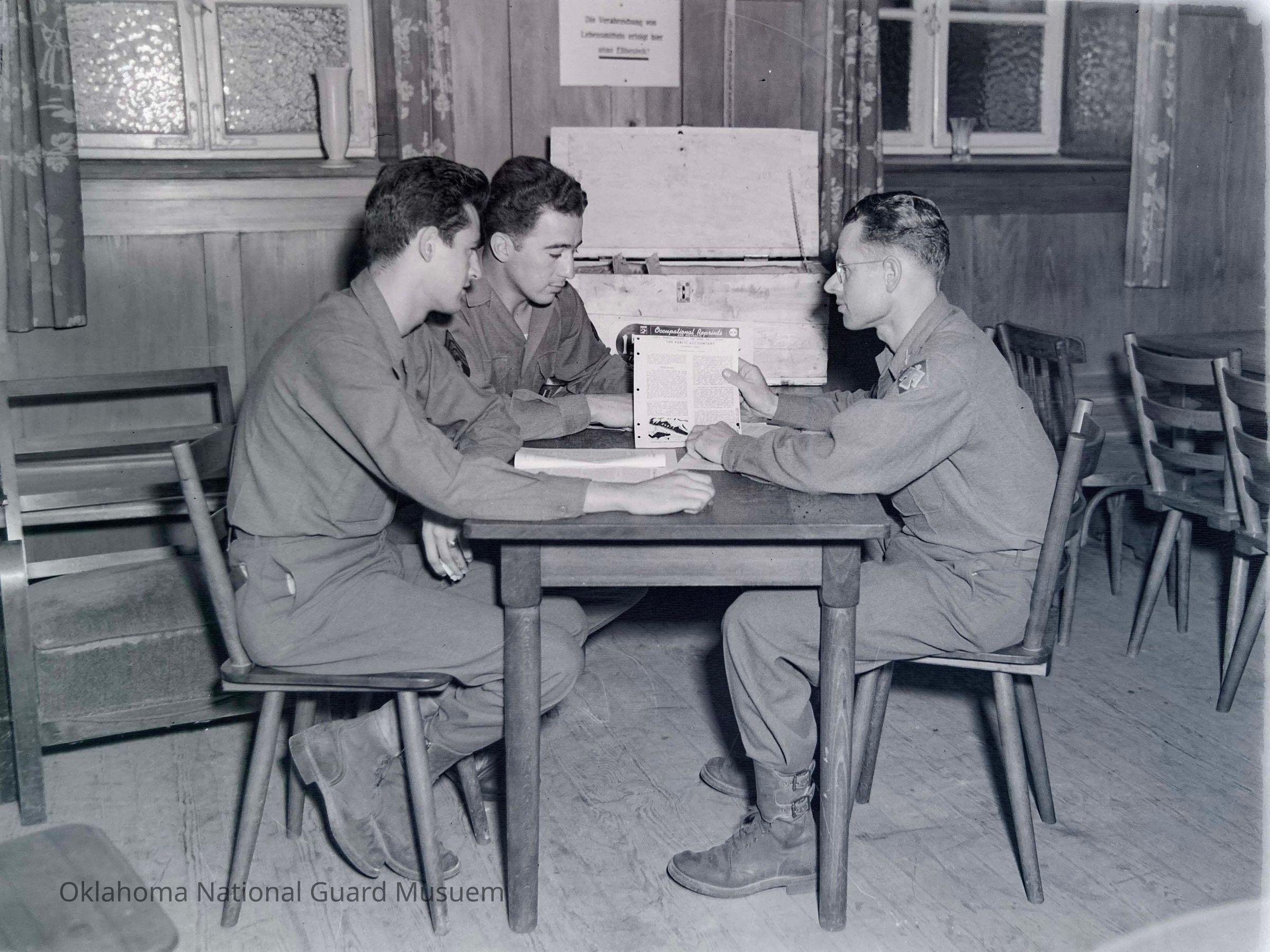 Negative of two soldiers listening to an officer explain civilian job opportunities