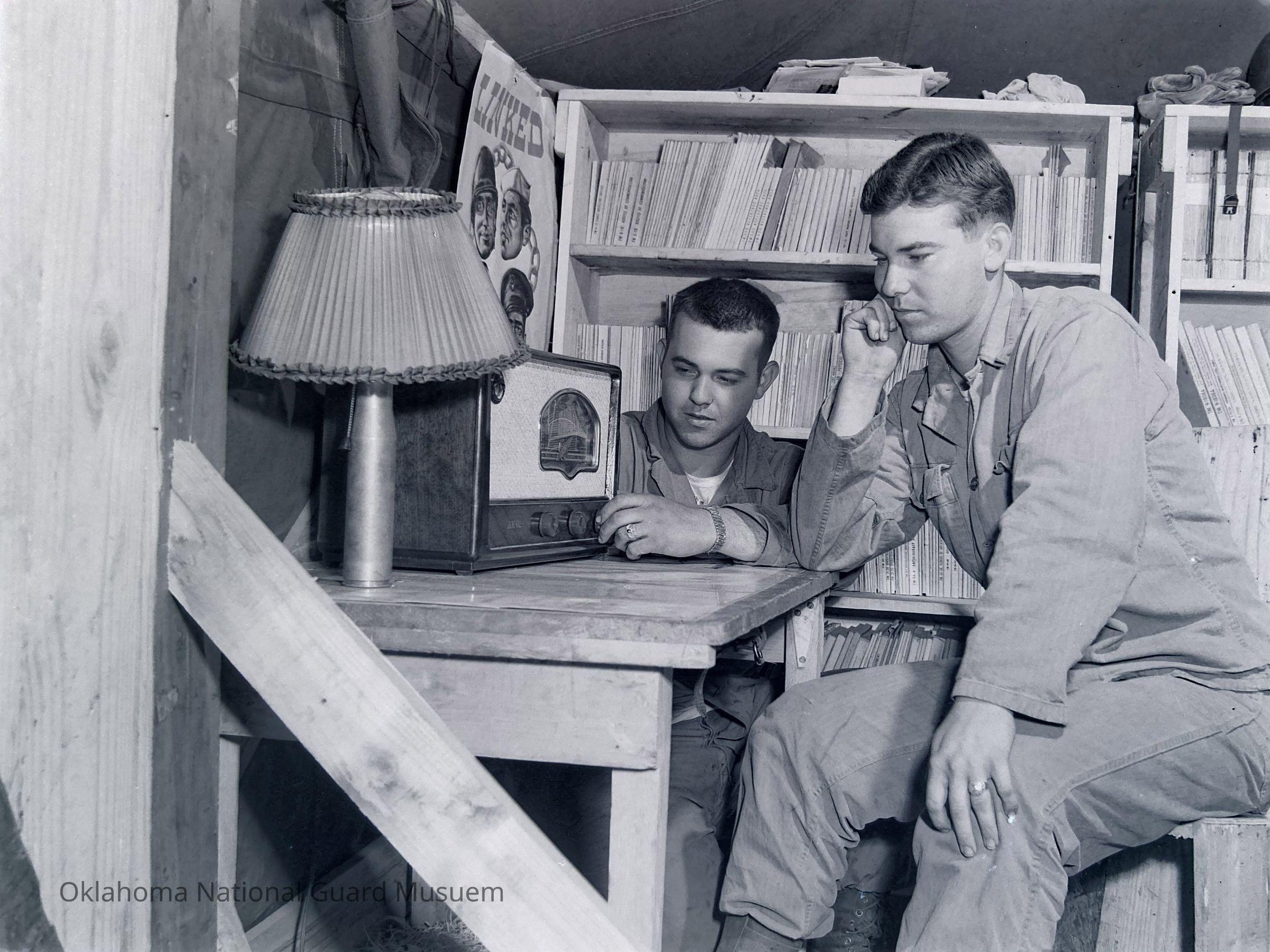 Two soldiers listening to radio in barracks library