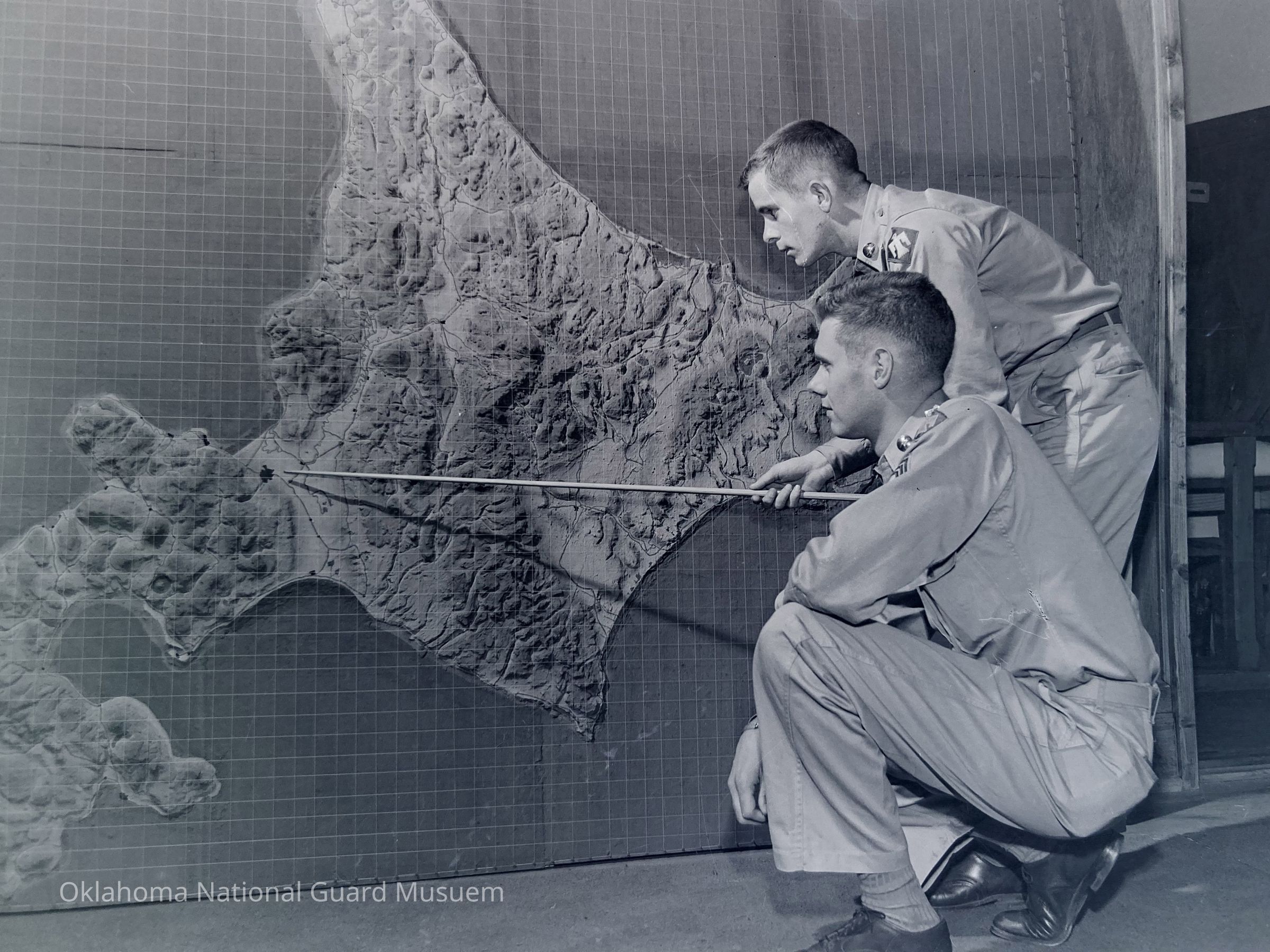 Negative of two soldiers looking at relief map of Hokkaido on Hokkaido, Japan