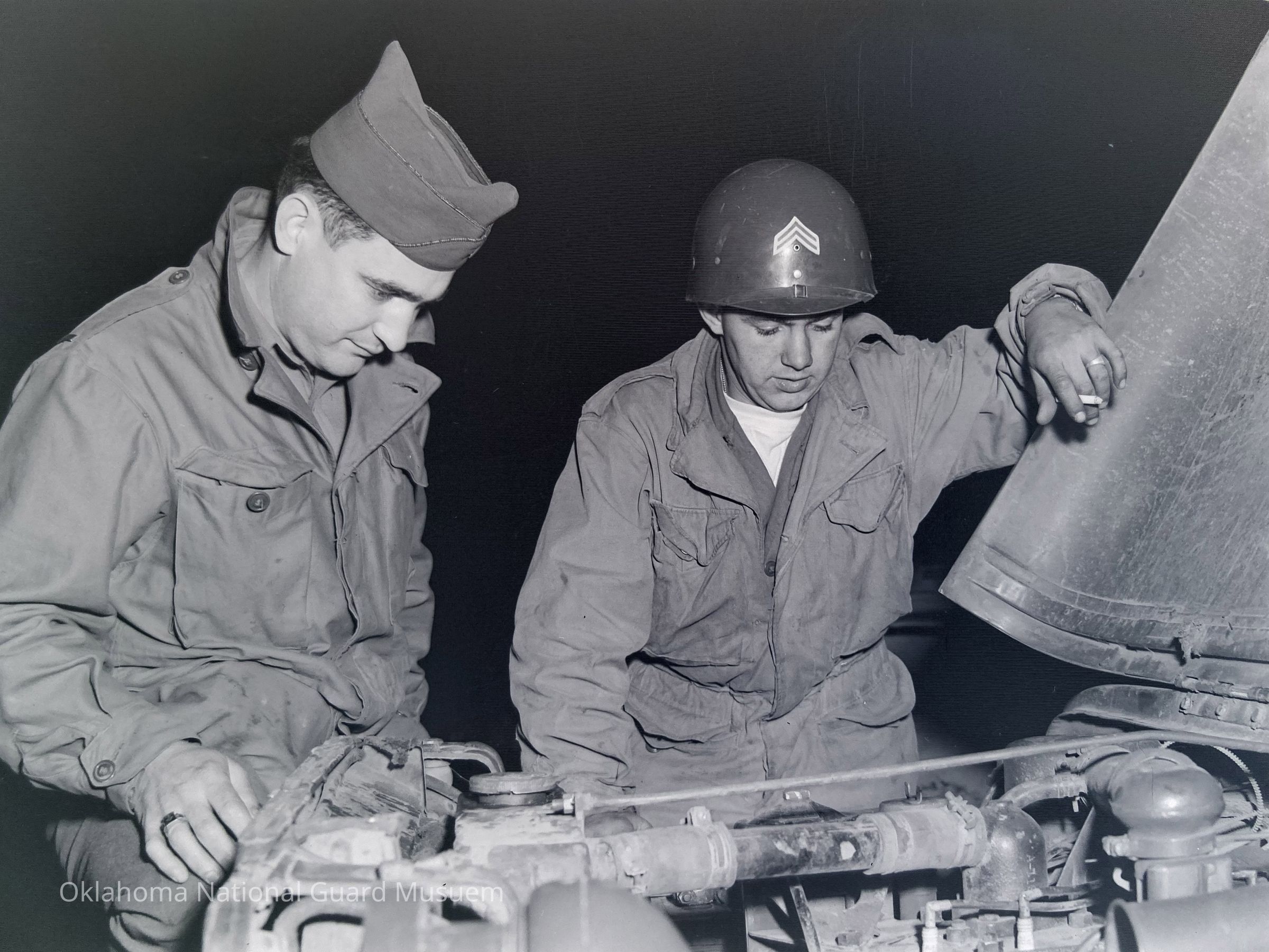 Negative of two soldiers looking under the hood of a Jeep on Hokkaido, Japan