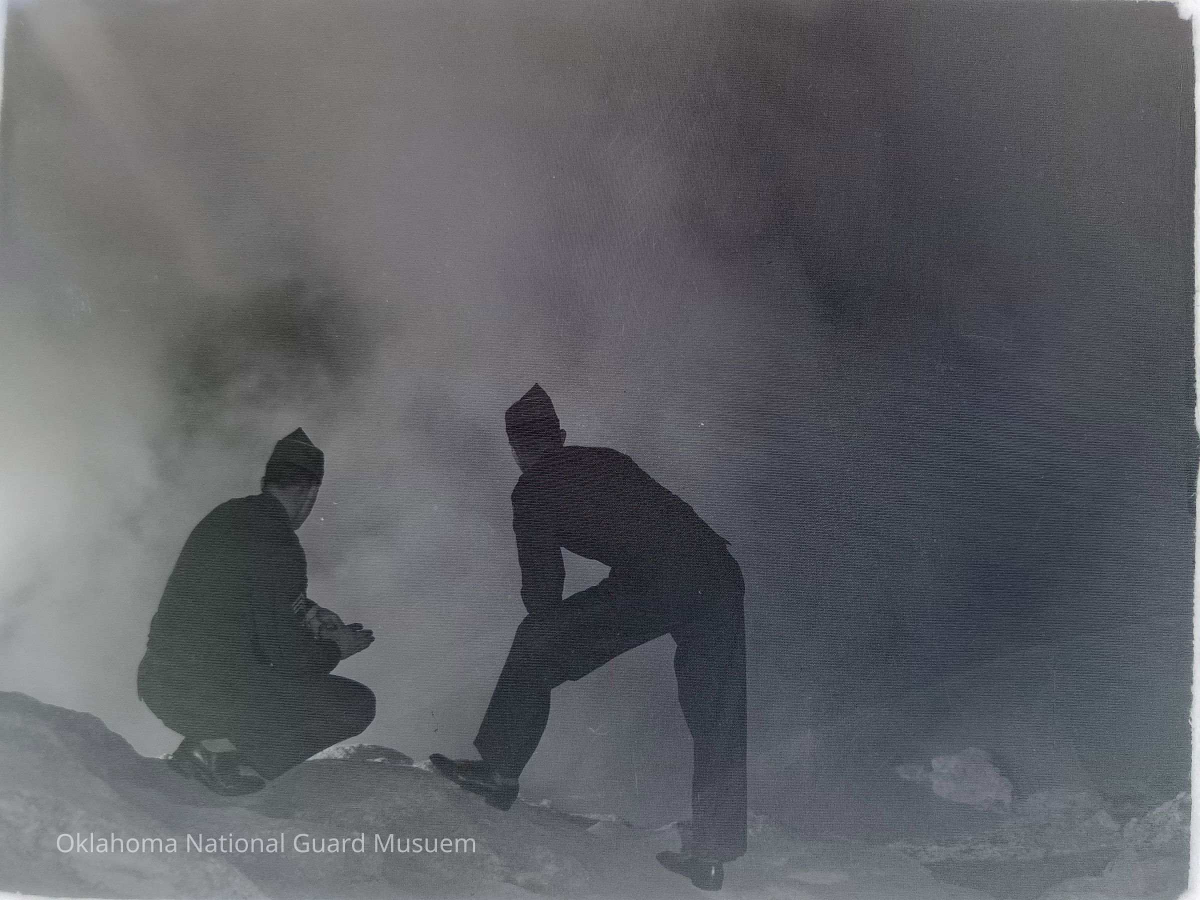 Negative of two soldiers observing a steaming spring on Hokkaido, Japan