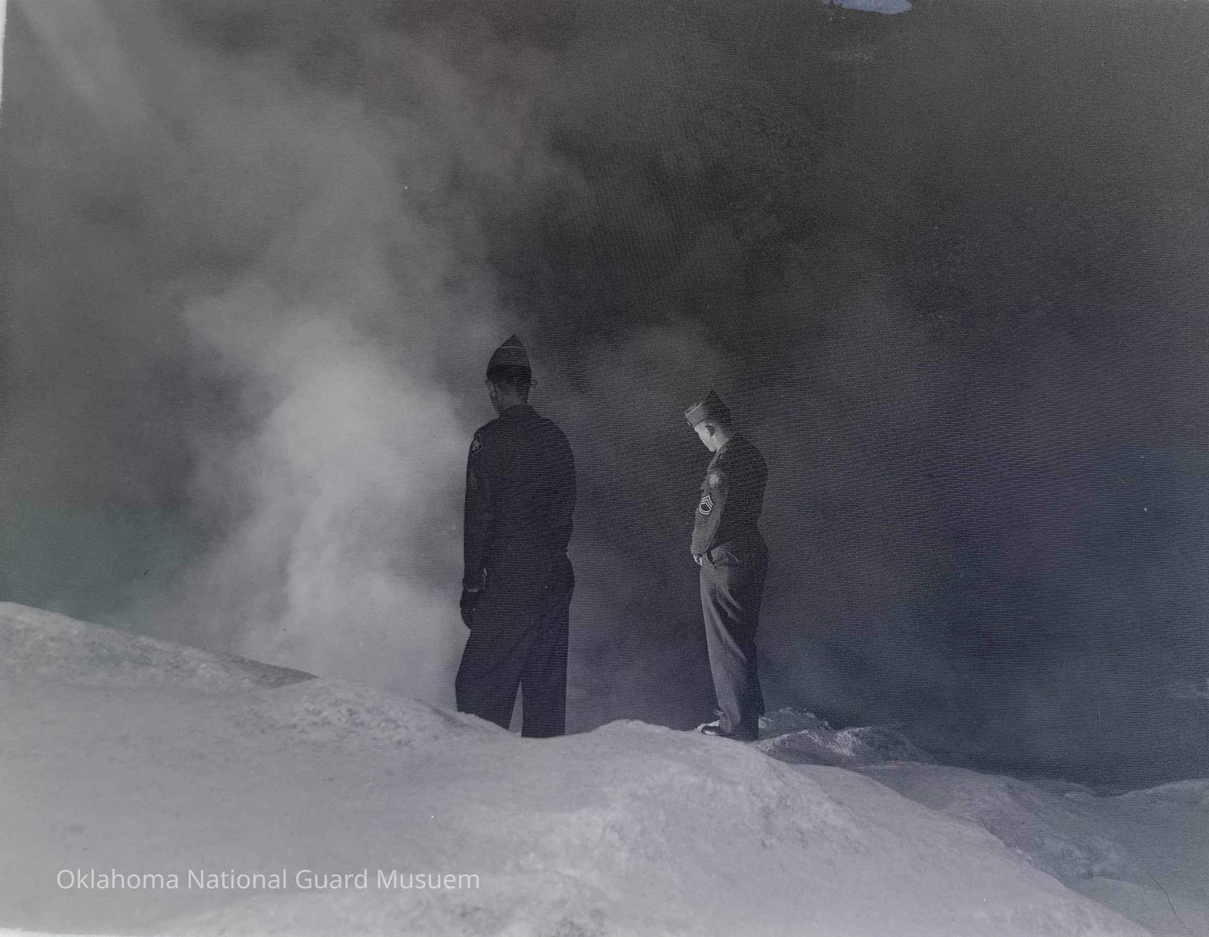 Negative of two soldiers observing a steaming spring on Hokkaido, Japan