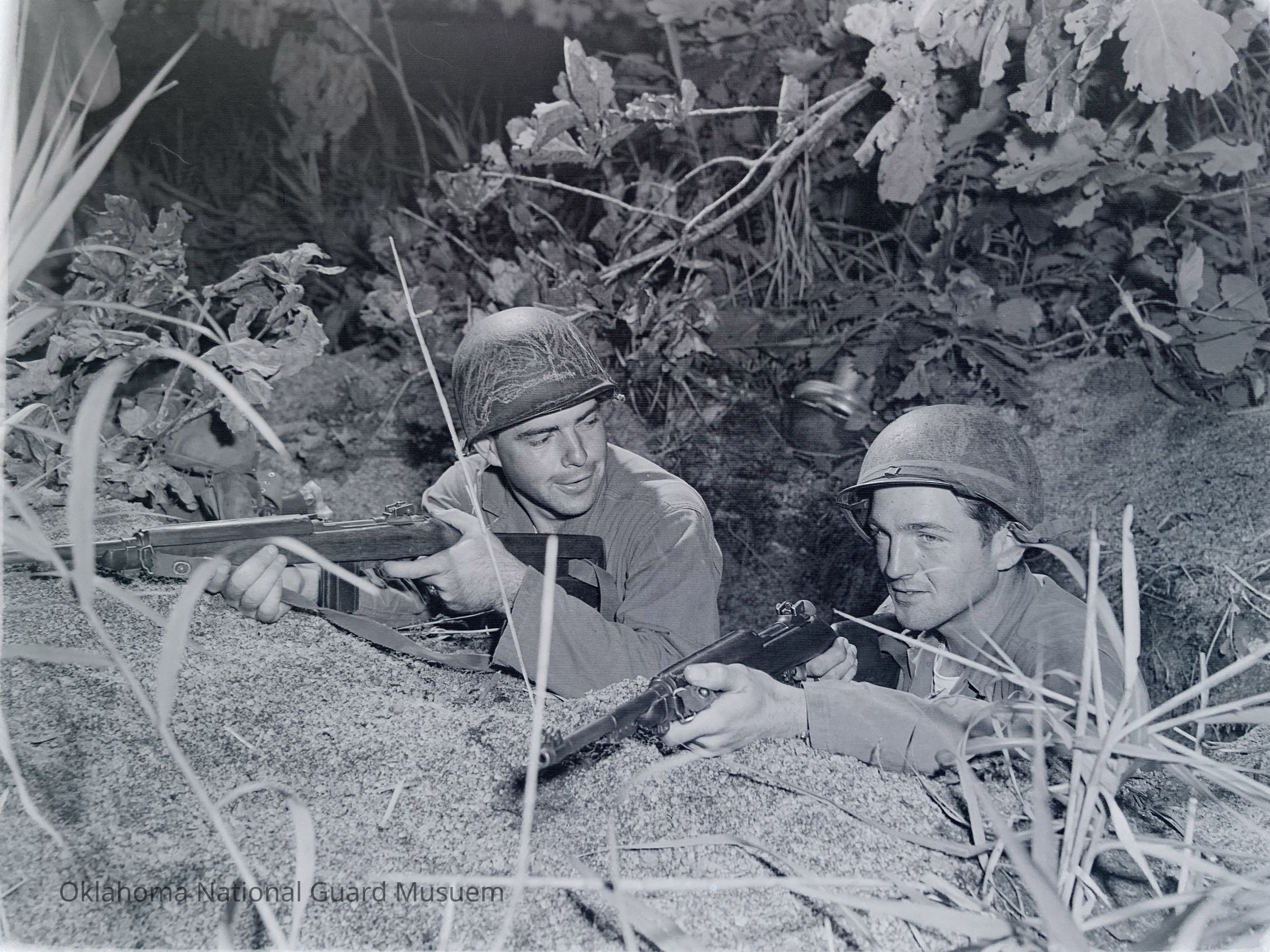 Two soldiers posed behind a rock in foxhole with their weapons
